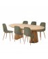 Sestava je ideální do moderních a skandinávsky laděných interiérů. Dubová dýha dodává prostoru přírodní charakter, zatímco tmavě zelené čalounění židlí přináší sofistikovaný kontrast. Perfektně se hodí do jídelny, která má být zároveň elegantní i útulná.