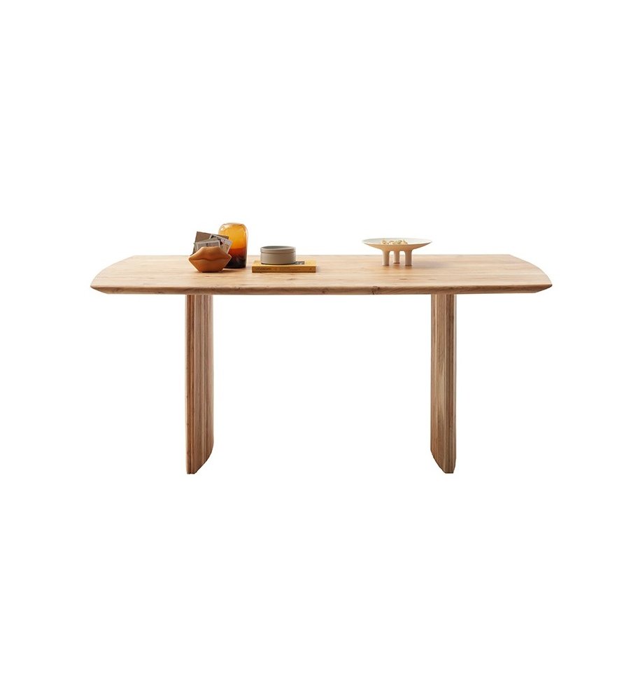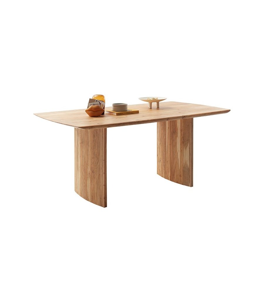 Jídelní stůl BRISCO vyniká moderním designem a poctivým řemeslným zpracováním z masivního dřeva akácie. Kombinuje čisté linie s přírodní kresbou dřeva a působivým podnožím tvořeným dvěma masivními sloupy s frézovanými lamelami, které dodávají celku lehkost i originalitu.