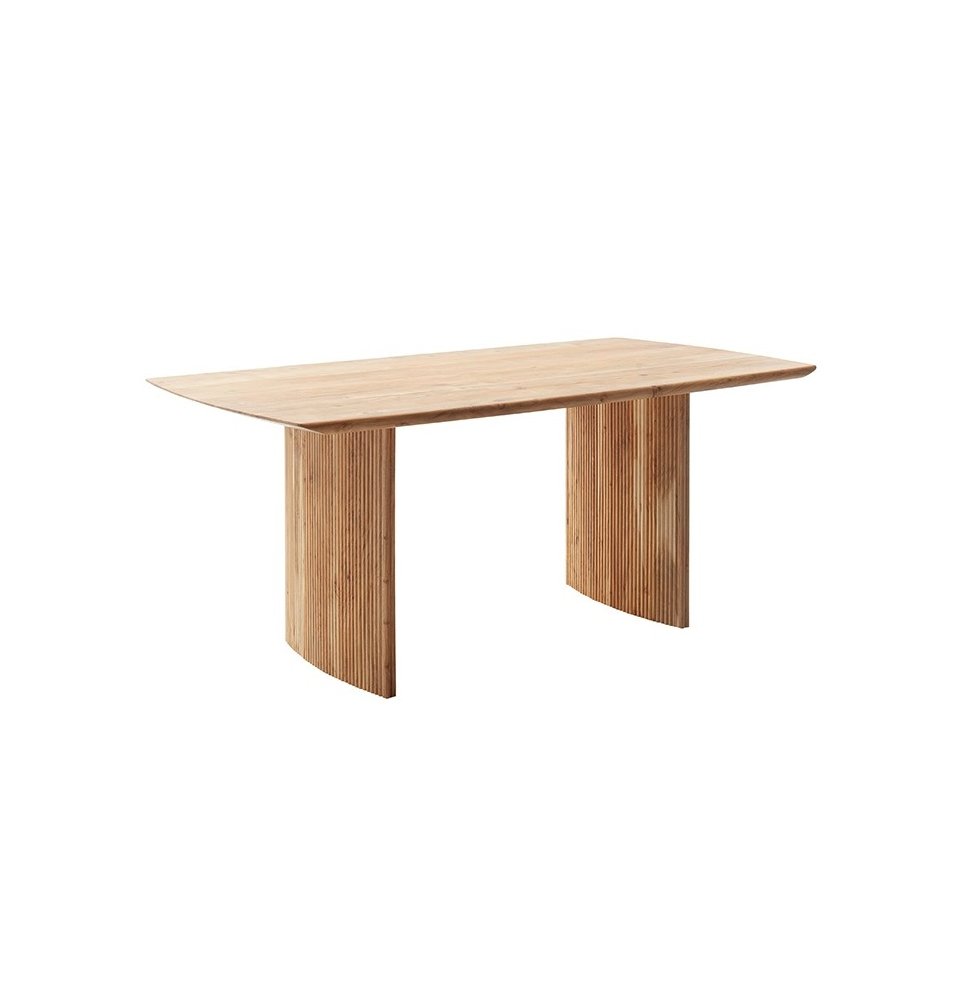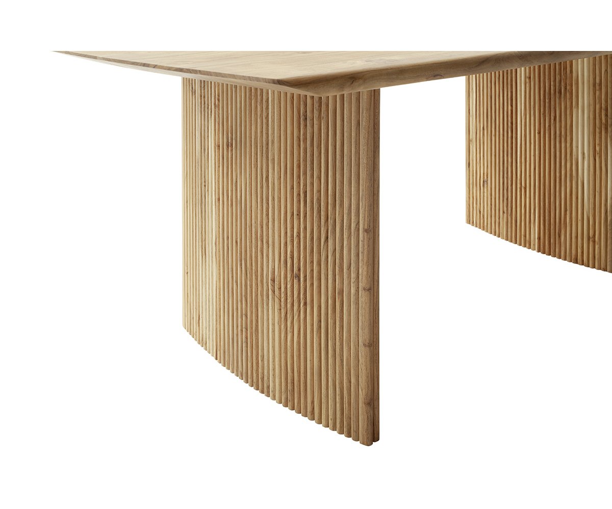 Jídelní stůl BRISCO vyniká moderním designem a poctivým řemeslným zpracováním z masivního dřeva akácie. Kombinuje čisté linie s přírodní kresbou dřeva a působivým podnožím tvořeným dvěma masivními sloupy s frézovanými lamelami, které dodávají celku lehkost i originalitu.