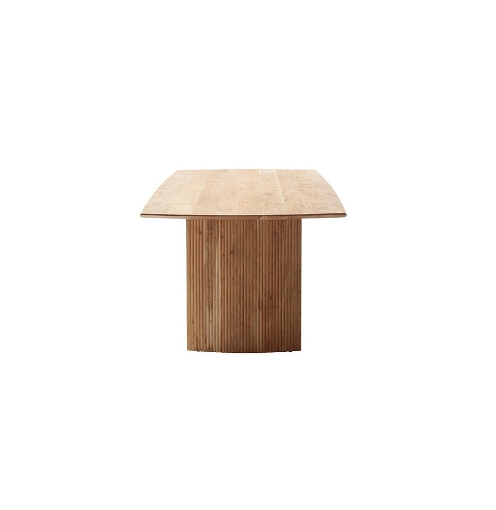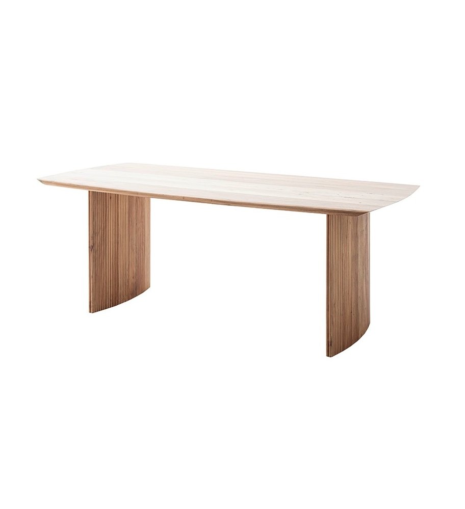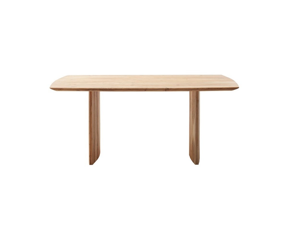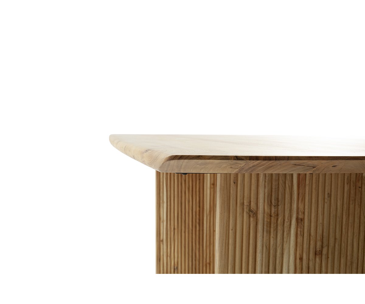 Jídelní stůl BRISCO vyniká moderním designem a poctivým řemeslným zpracováním z masivního dřeva akácie. Kombinuje čisté linie s přírodní kresbou dřeva a působivým podnožím tvořeným dvěma masivními sloupy s frézovanými lamelami, které dodávají celku lehkost i originalitu.