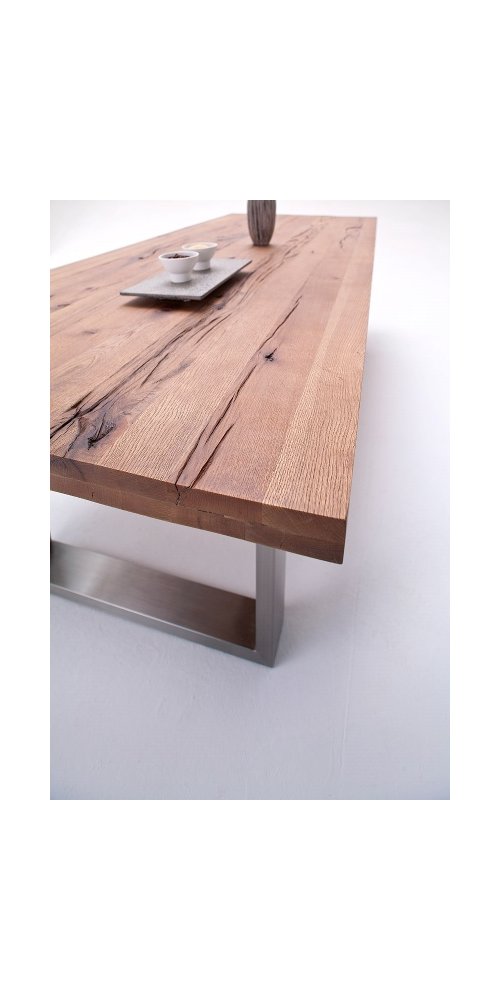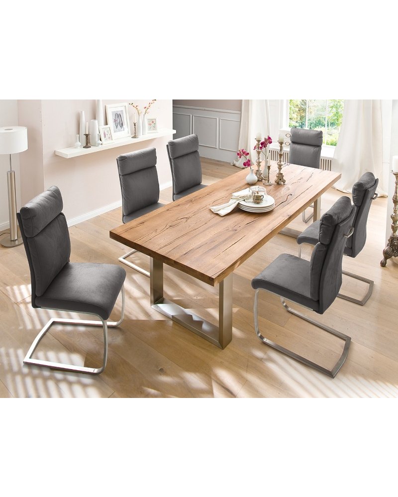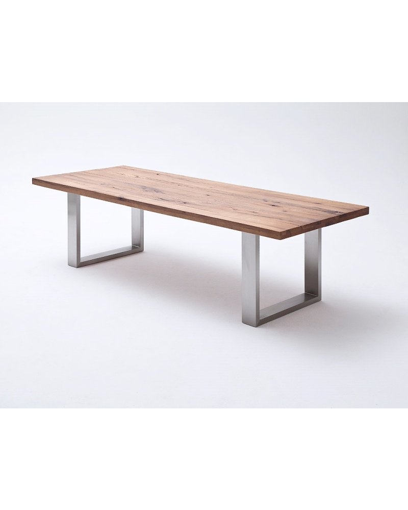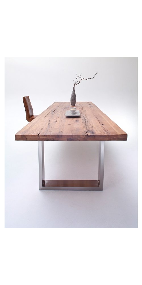 Design jídelního stolu CASTELLO osloví každého, kdo má rád přírodní materiály a zařizuje bydlení v moderním stylu. Desky stolu jsou vyráběny z divokého dubu v tmavém odstínu bassano a masiv je záměrně vybírán s prasklinami a suky, které dodávají stolu tu pravou přírodní atmosféru. Nosná konstrukce nohou je zhotovena z leštěné oceli. Stůl lze skvěle kombinovat s různými typy židlí, fantazii se meze nekladou.