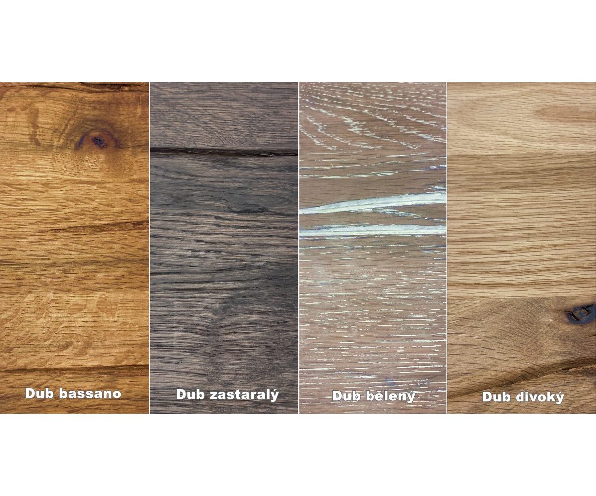 Dřevěnou desku stolu nabízíme ve čtyřech odstínech: dub divoký přírodní, dub bassano, dub bělený nebo dub zastaralý.