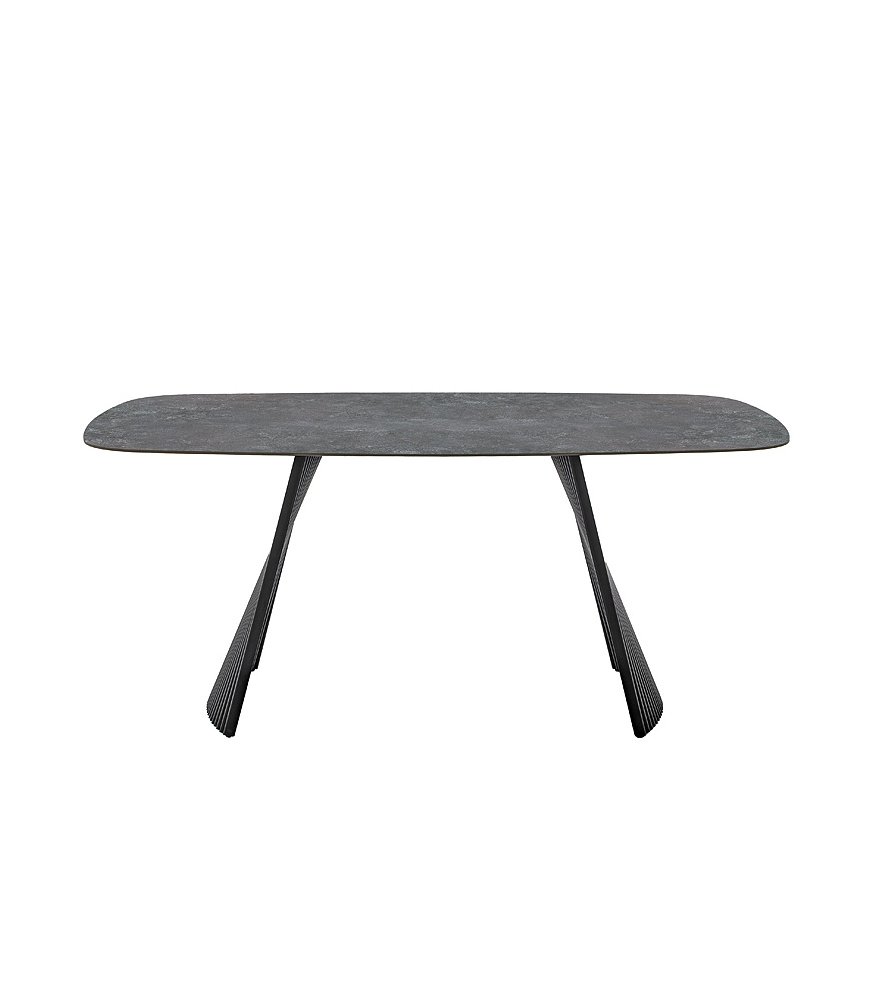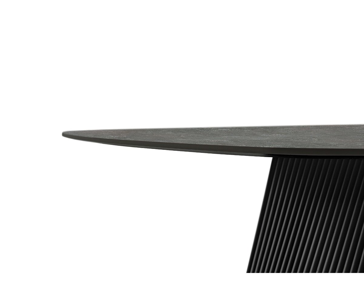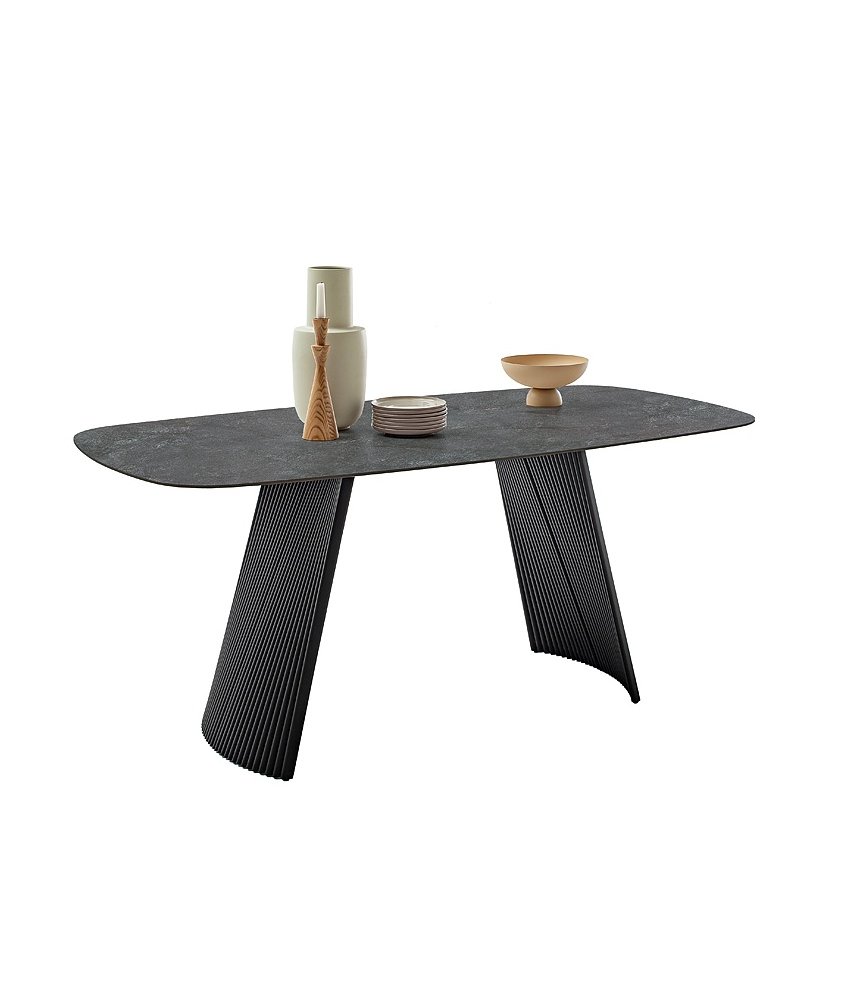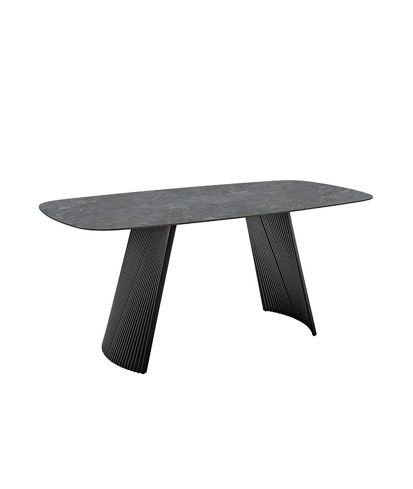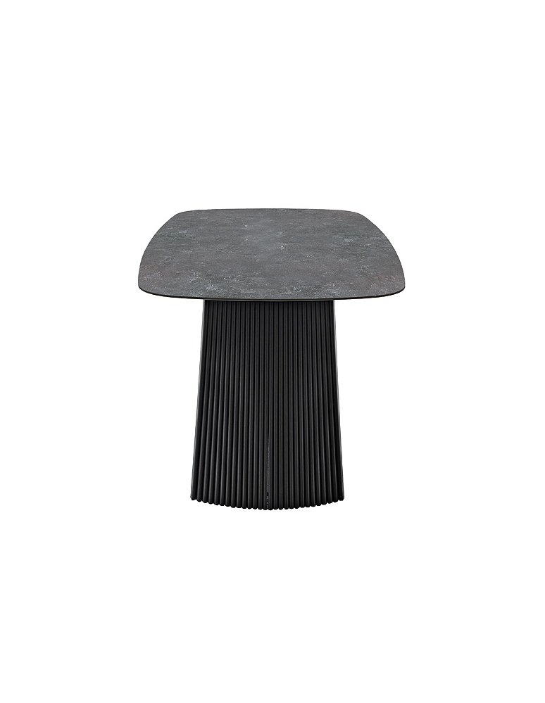 Rozměry: cca 180 × 90 × 76 cm Materiál desky: keramika (tloušťka 11 mm) Materiál podnože: kov, černě matně lakovaný Barva: antracitový mramor / černá