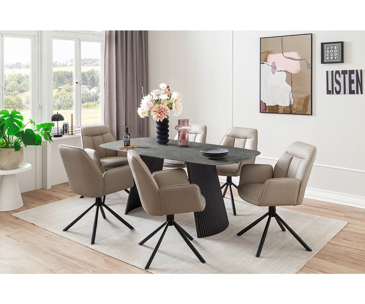Jídelní stůl TOBELO v provedení antracitový mramor nabízí moderní vzhled s industriálním nádechem. Keramická deska s tmavým mramorovým dekorem dodává interiéru elegantní a luxusní výraz, zatímco její povrch je mimořádně odolný a nenáročný na údržbu. Černě matně lakovaná kovová podnož s výraznou žebrovanou strukturou působí stabilně a designově. Kombinace tmavé desky a černé konstrukce vytváří harmonický celek vhodný do stylově zařízených jídelen či moderních kuchyní.
