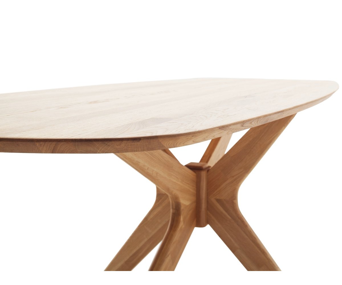 Stůl zaujme oválnou deskou se švýcarskou hranou, která působí lehce a moderně. O originální charakter se stará masivní centrální podnož ve tvaru pavouka (Spider) – stabilní, robustní a zároveň esteticky působivá. Díky centrální konstrukci mají všichni u stolu dostatek prostoru pro pohodlné sezení.
