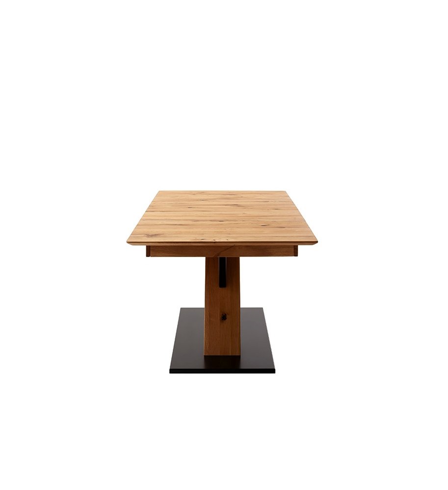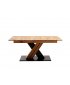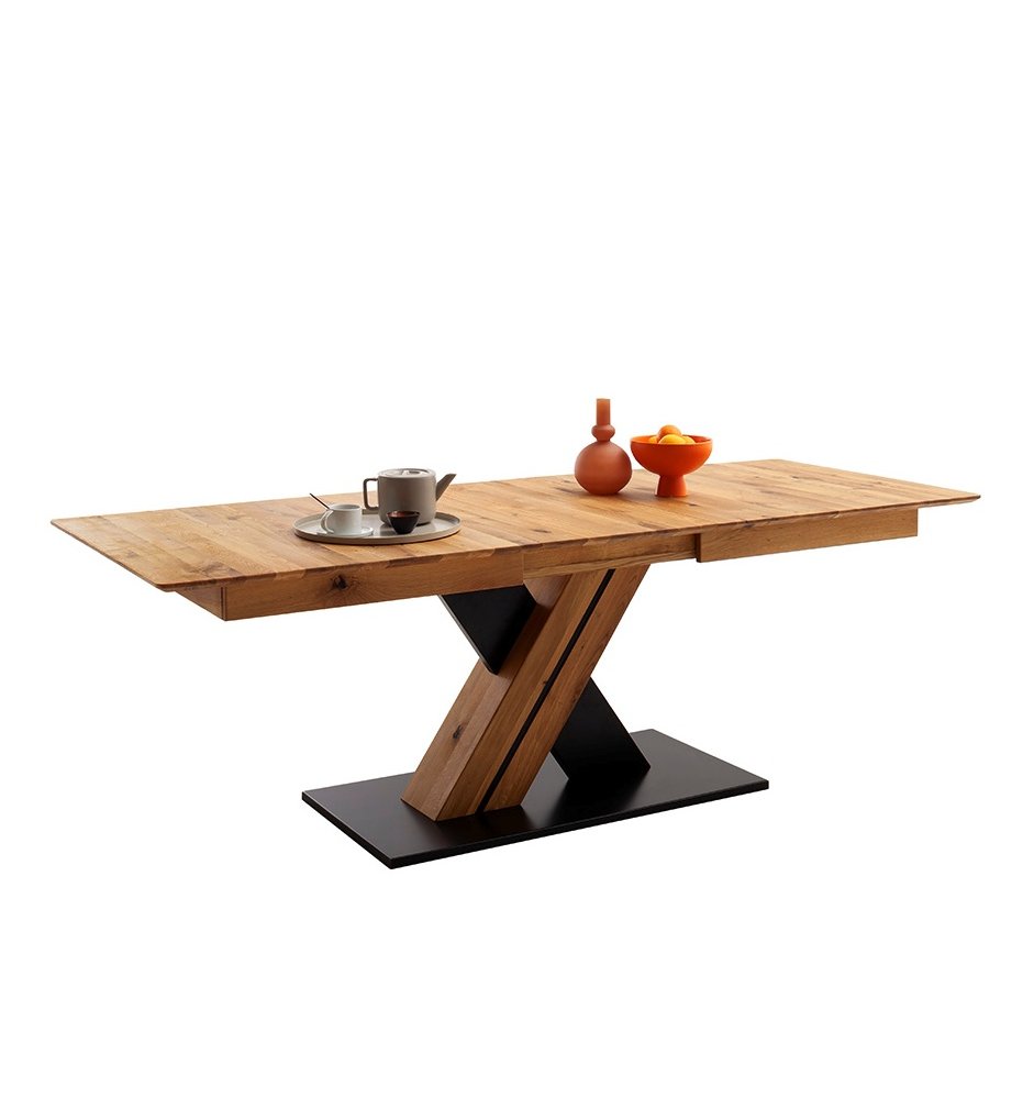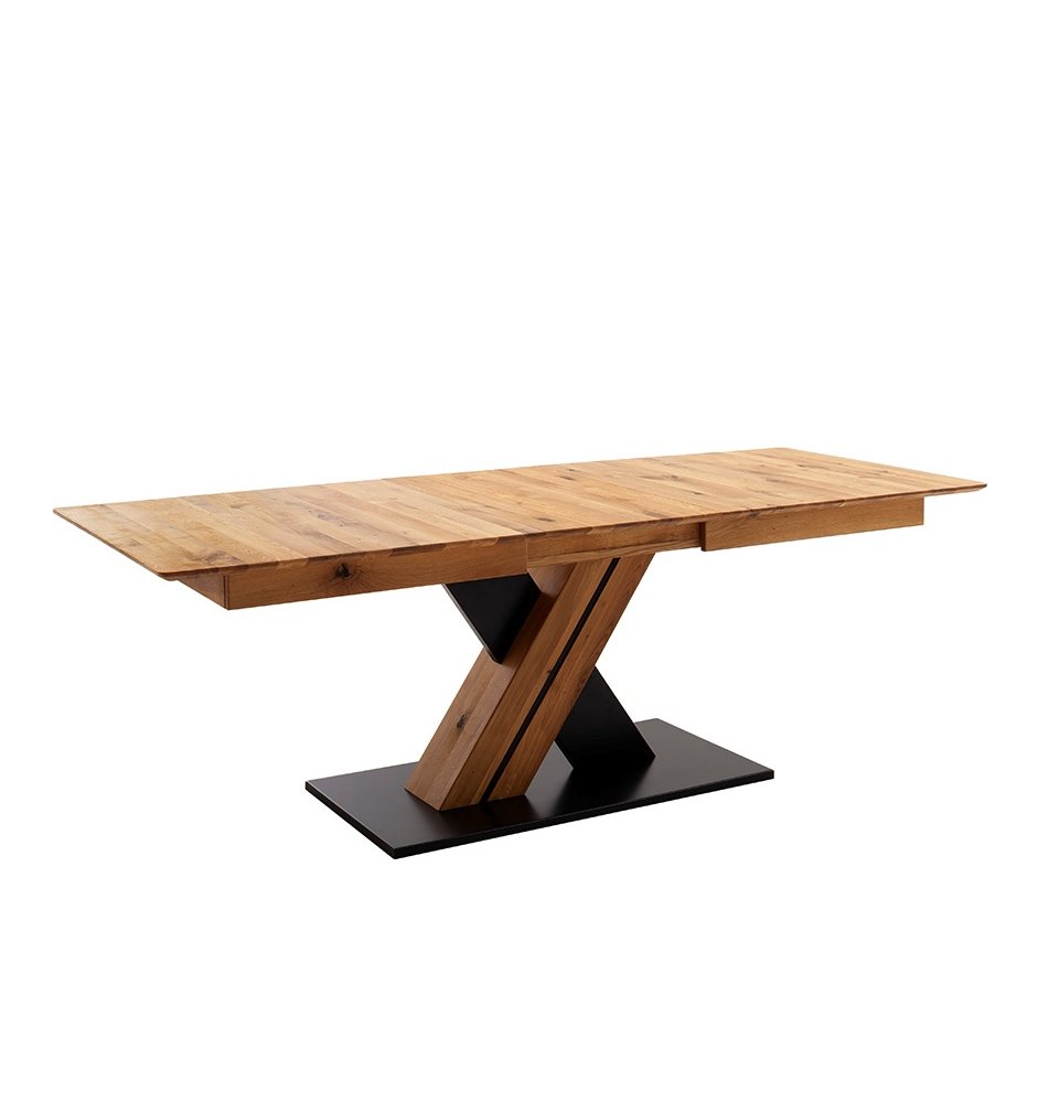 Dominantním prvkem modelu MORENA X je křížová podnož ve tvaru písmene X, vyrobená z kombinace masivního dubu a MDF desky lakované v antracitově černé barvě. Celou konstrukci doplňuje stabilní základna z MDF lakovaná v antracitově šedém odstínu, která dodává stolu pevnost a moderní charakter. Spojení teplého tónu dřeva s kontrastní kovově-antracitovou barvou vytváří výrazný, ale harmonický design, ideální pro moderní i přírodně laděné interiéry.
