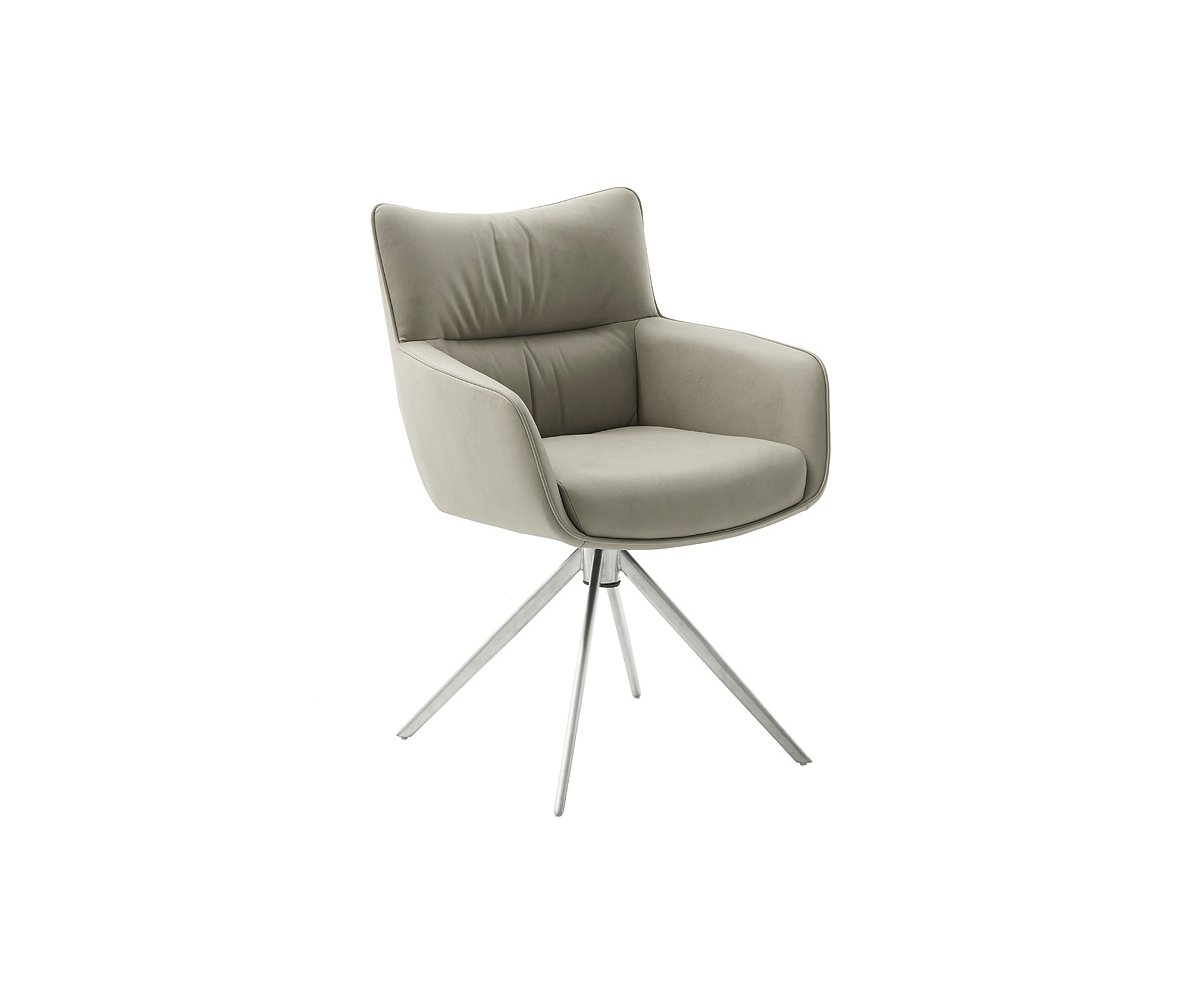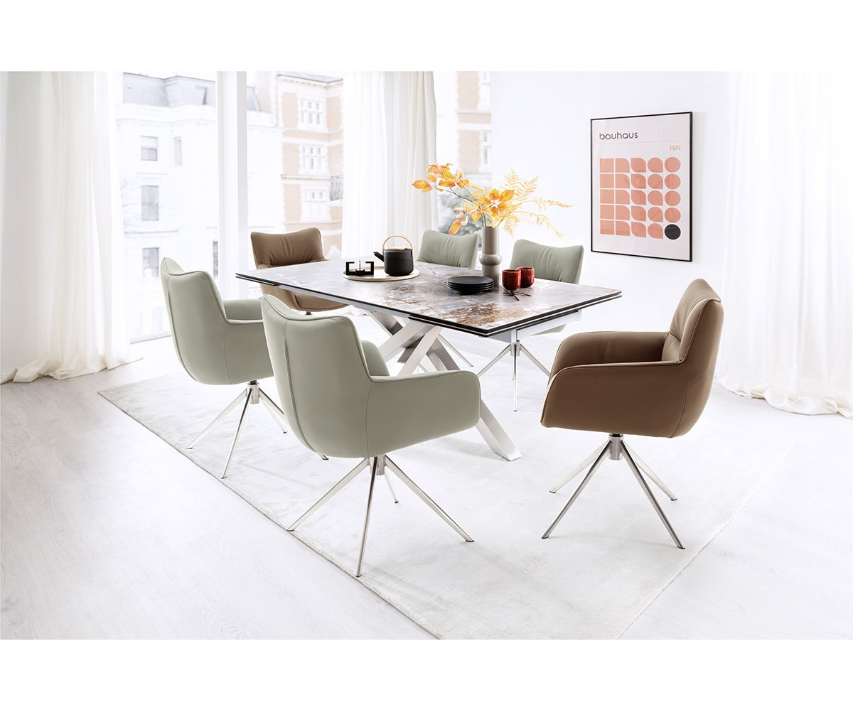 Jídelní židle LIMONE vyniká moderním designem, který spojuje eleganci s maximálním komfortem. Díky otočné funkci o 360° a automatickému vratnému mechanismu nabízí nejen praktické využití, ale i pohodlí při každodenním sezení. Čalounění z pravé kůže působí luxusně a zároveň je odolné vůči opotřebení. Podnož z kartáčované nerezové oceli dodává židli stabilitu a stylový vzhled, zatímco sedák s integrovanými kapesními pružinami se postará o výjimečný komfort i při delším sezení. LIMONE je tak ideální volbou pro moderní jídelny, kde se snoubí design, kvalita a pohodlí.