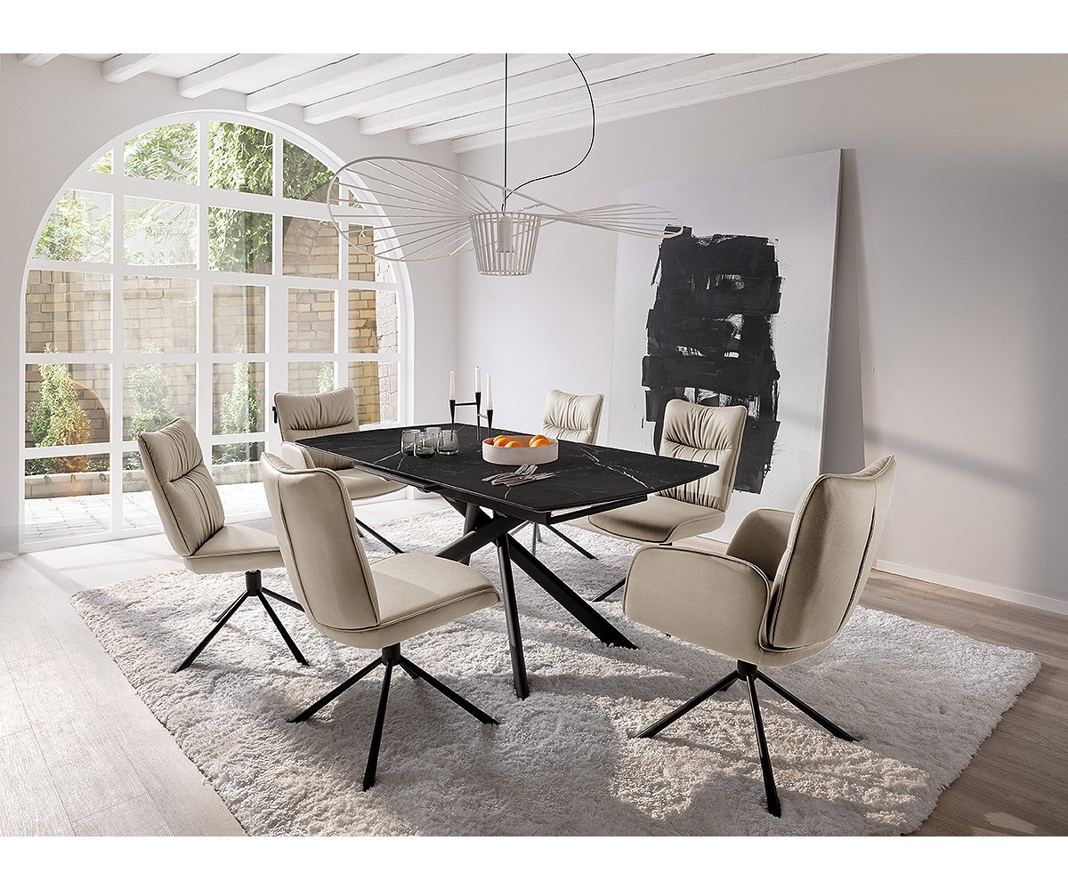 Černě matná kovová podnož v kónickém tvaru dodává židli moderní charakter a zároveň zaručuje stabilitu. Díky otočné konstrukci o 360° s funkcí automatického návratu je židle nejen stylová, ale i praktická – ideální do jídelny, domácí pracovny nebo zasedací místnosti.