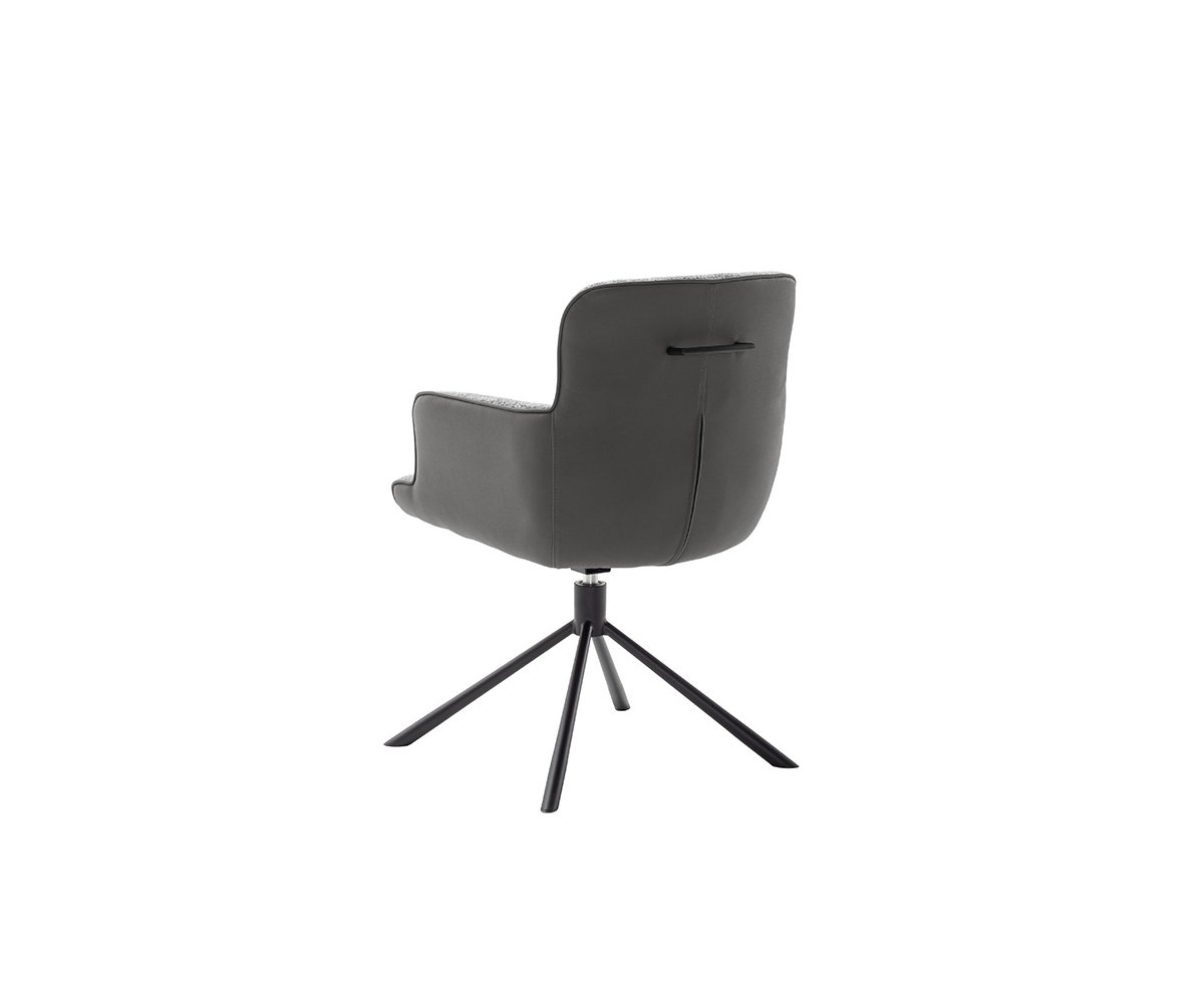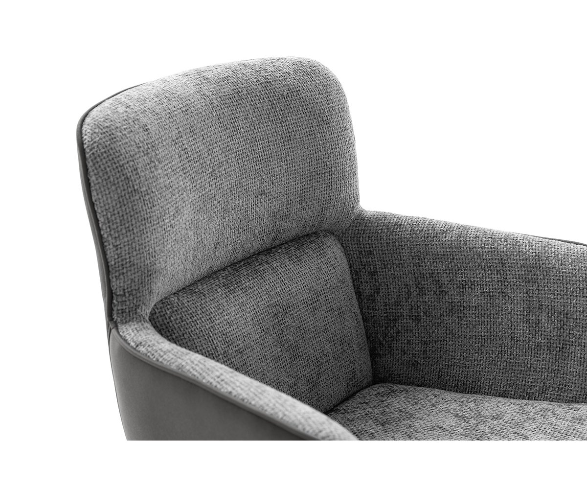 Židle je čalouněná kombinací dvou typů látek – přední strana je potažena strukturovanou látkou s jemnou texturou, zatímco zadní část a boky jsou vyrobeny z hladké látky, která působí elegantně a harmonicky. Tento kontrast dodává židli jedinečný charakter i vizuální hloubku.