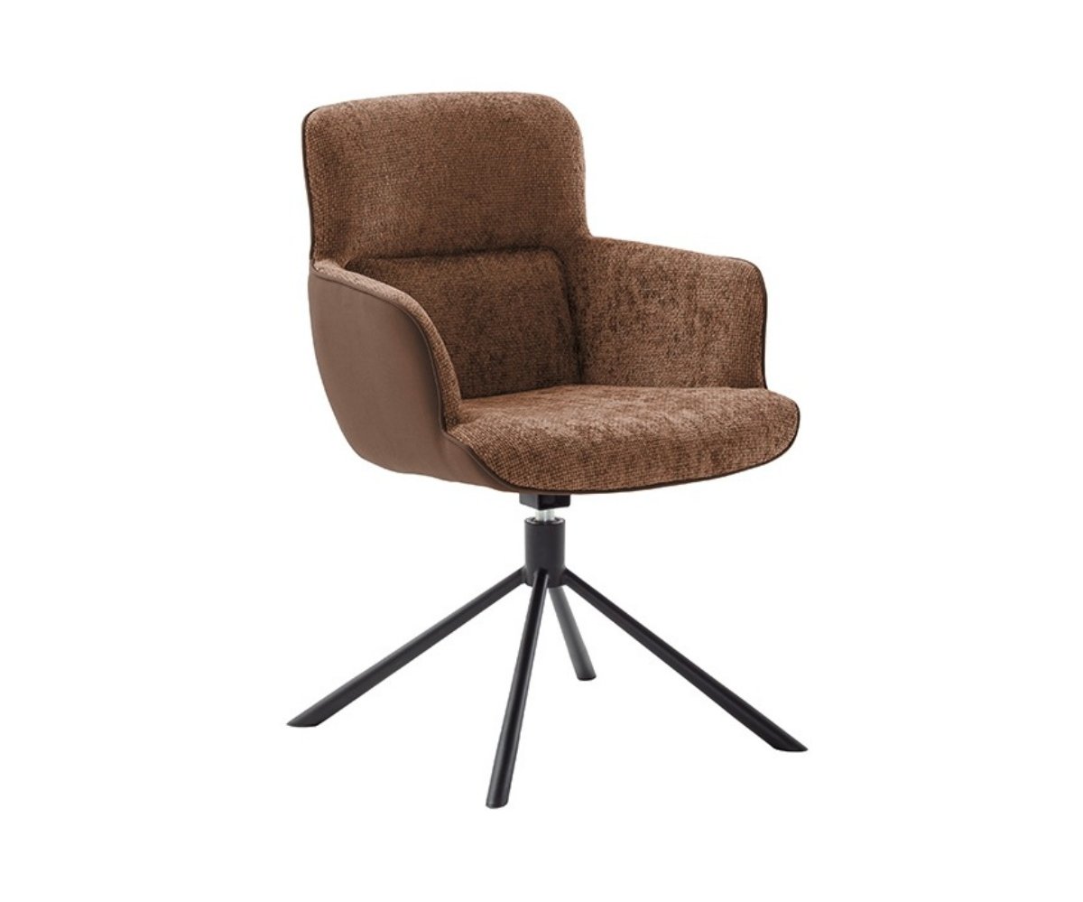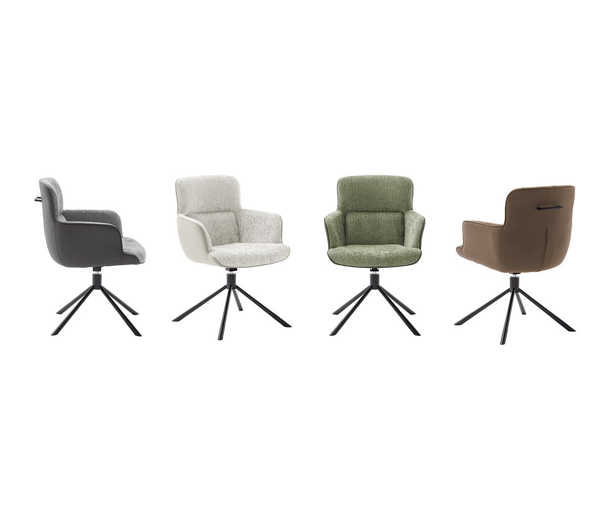 Židle je čalouněná kombinací dvou typů látek – přední strana je potažena strukturovanou látkou s jemnou texturou, zatímco zadní část a boky jsou vyrobeny z hladké látky, která působí elegantně a harmonicky. Tento kontrast dodává židli jedinečný charakter i vizuální hloubku.