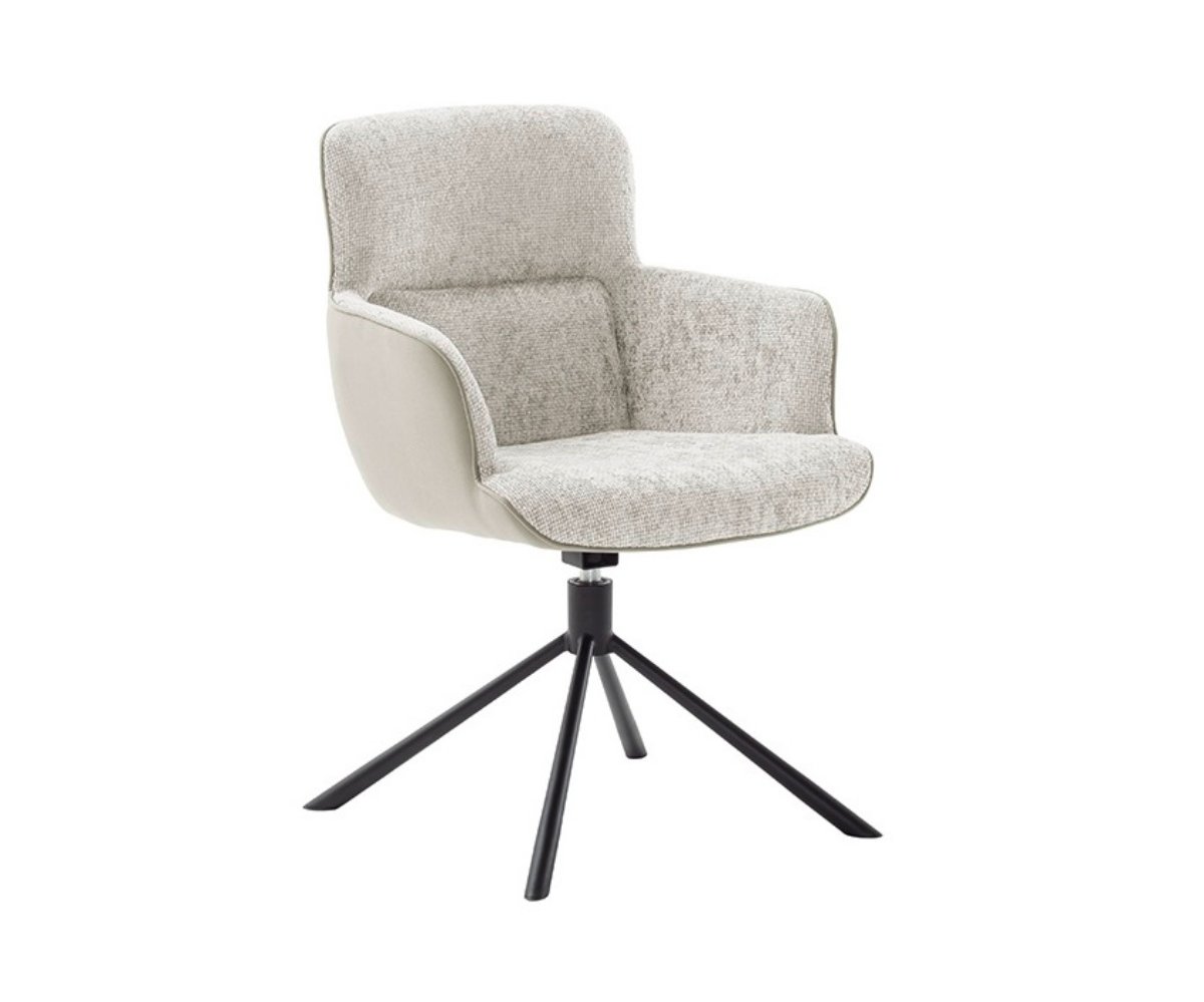 Židle je čalouněná kombinací dvou typů látek – přední strana je potažena strukturovanou látkou s jemnou texturou, zatímco zadní část a boky jsou vyrobeny z hladké látky, která působí elegantně a harmonicky. Tento kontrast dodává židli jedinečný charakter i vizuální hloubku.