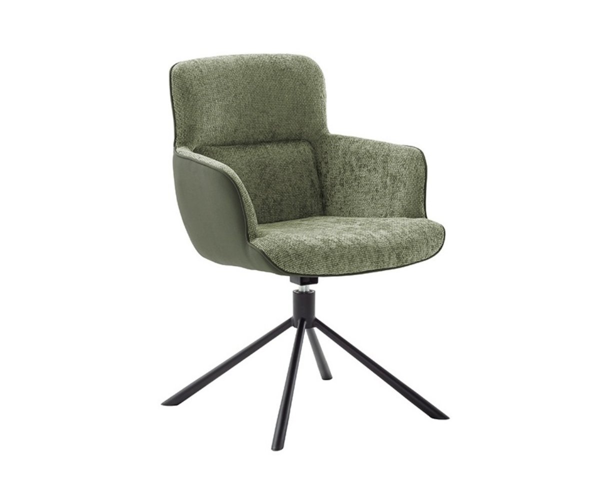 Židle je čalouněná kombinací dvou typů látek – přední strana je potažena strukturovanou látkou s jemnou texturou, zatímco zadní část a boky jsou vyrobeny z hladké látky, která působí elegantně a harmonicky. Tento kontrast dodává židli jedinečný charakter i vizuální hloubku.