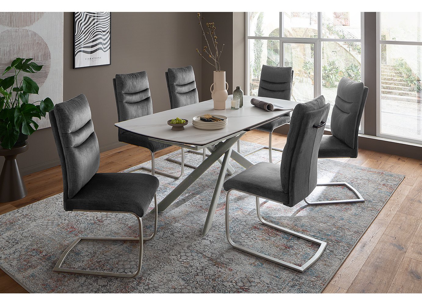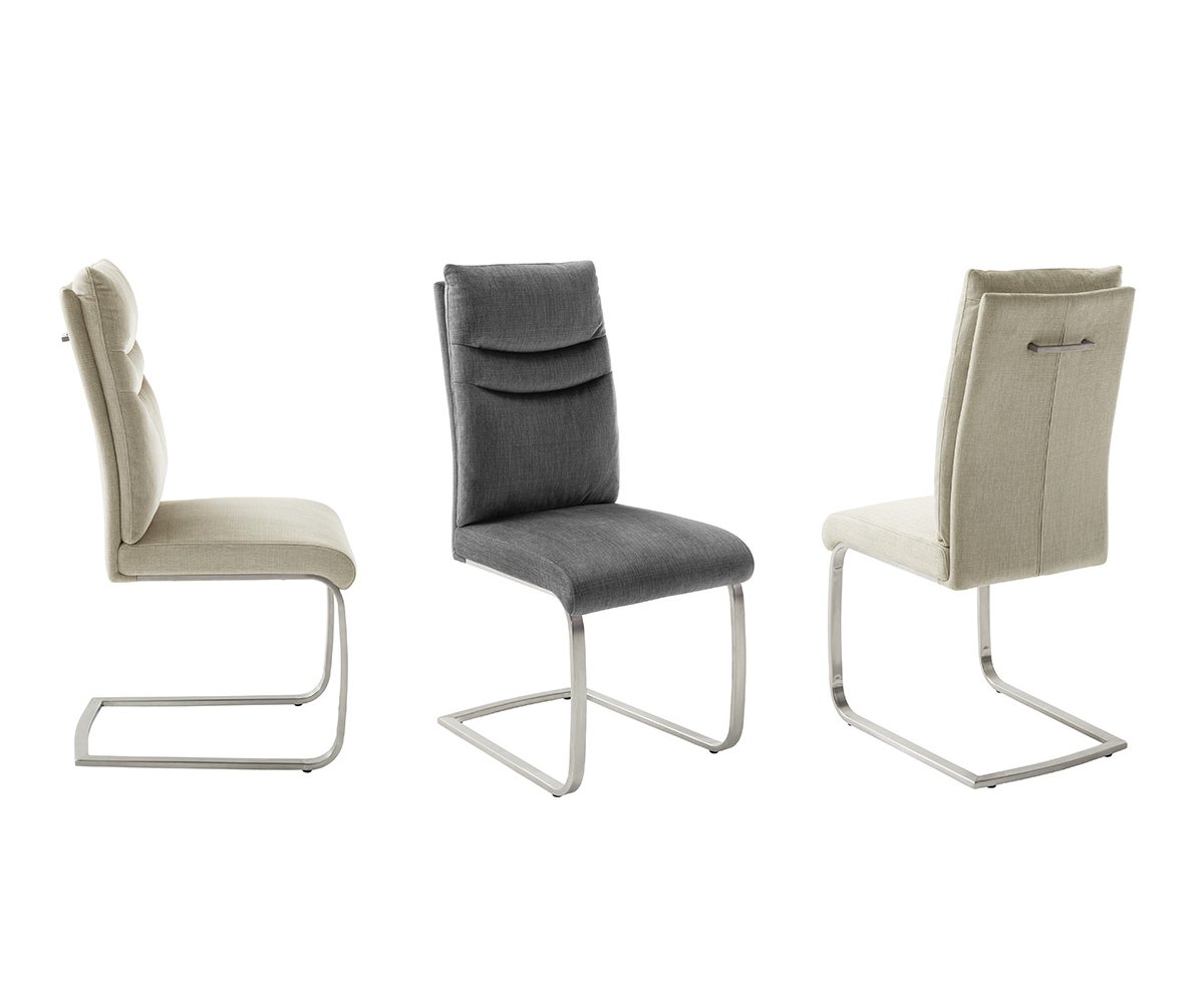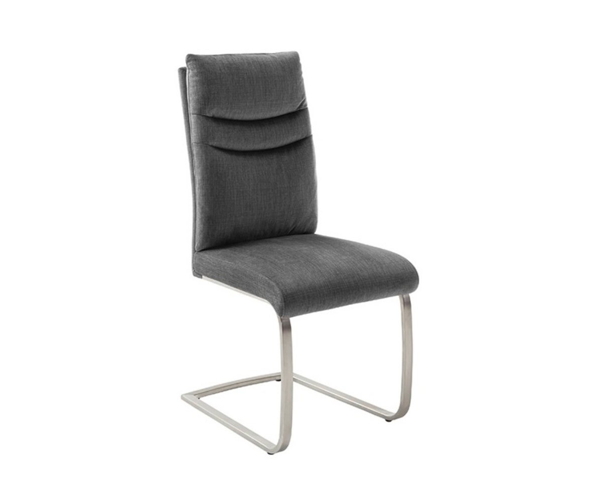 Pohodlné sezení zajišťuje Nosag pružinové odpružení v sedáku, které nabízí příjemnou měkkost a dlouhodobý komfort při sezení. Stabilní kovová podnož z plochých trubek z kartáčované nerezové oceli vytváří elegantní kontrast k čalounění a poskytuje židli pevnost i lehký houpací efekt, typický pro cantilever konstrukci.