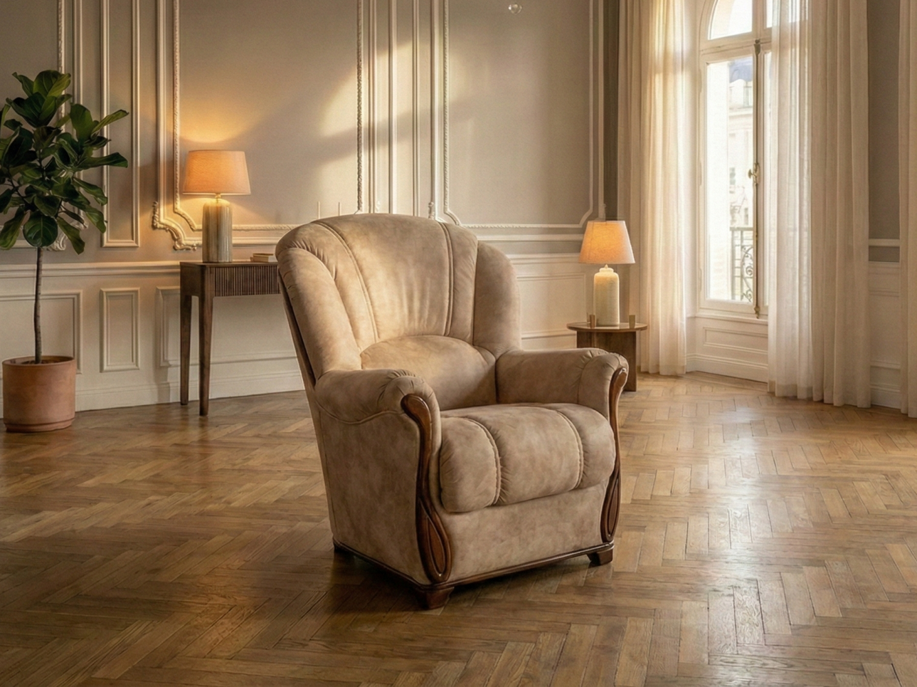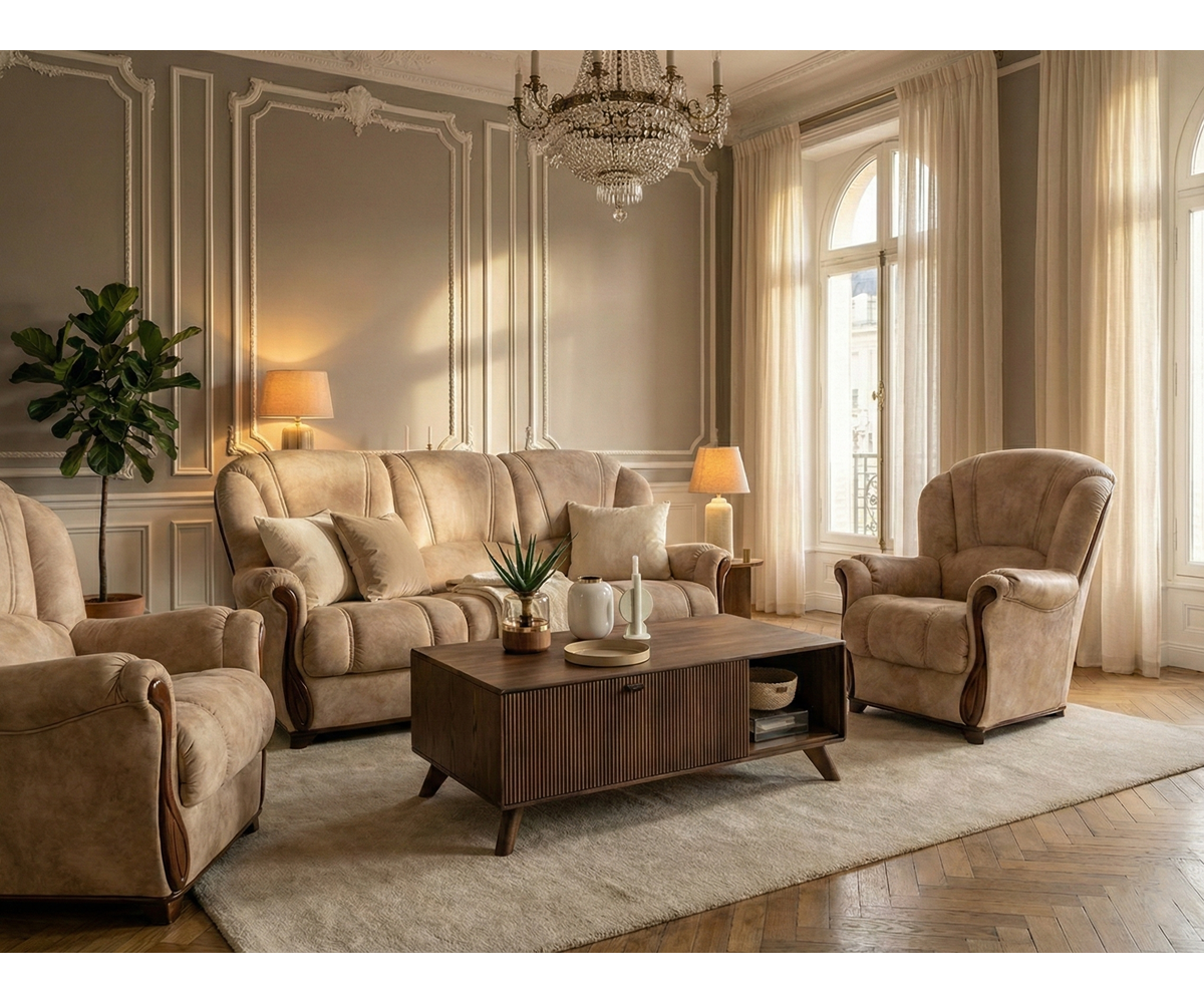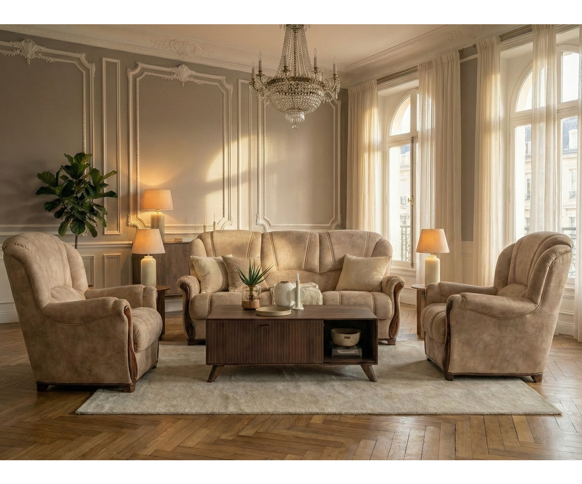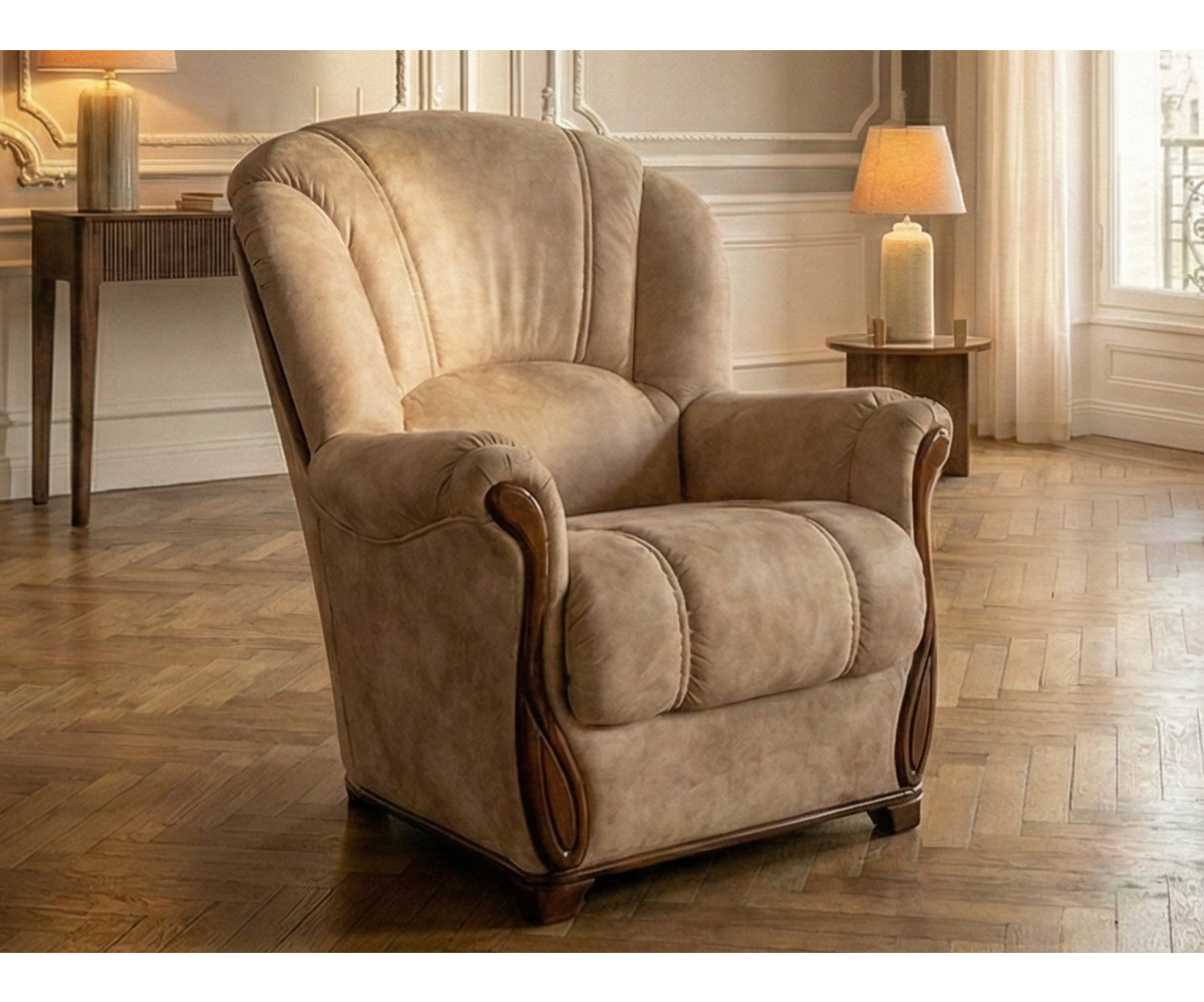 Pohodlné křeslo DI CAPRIO je vhodné do konzervativně laděného obývacího interiéru, ve kterém bude skvělě ladit se dřevěným nábytkem. Vysoká opěradla zajišťují dokonalý komfort při sezení. Výrazným prvkem jsou také charakteristické proševy v potahové látce a vyřezávané dřevěné područky.Potahové látky jsou velmi pevné, odolné a kvalitní.