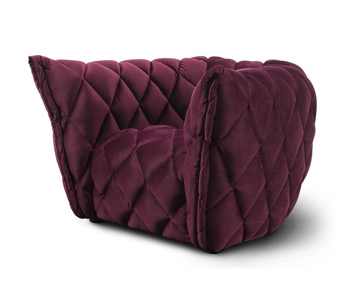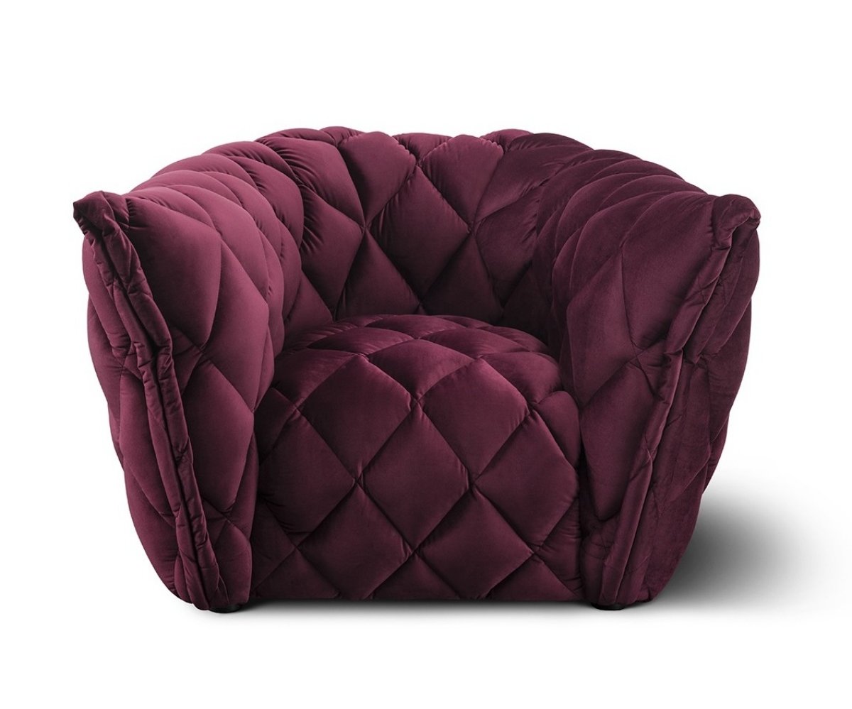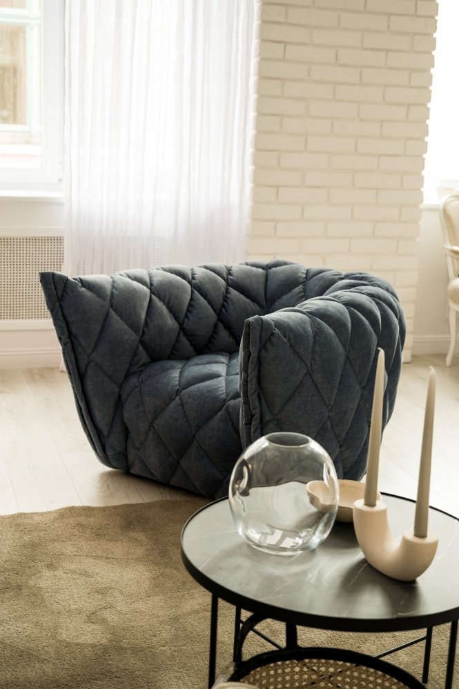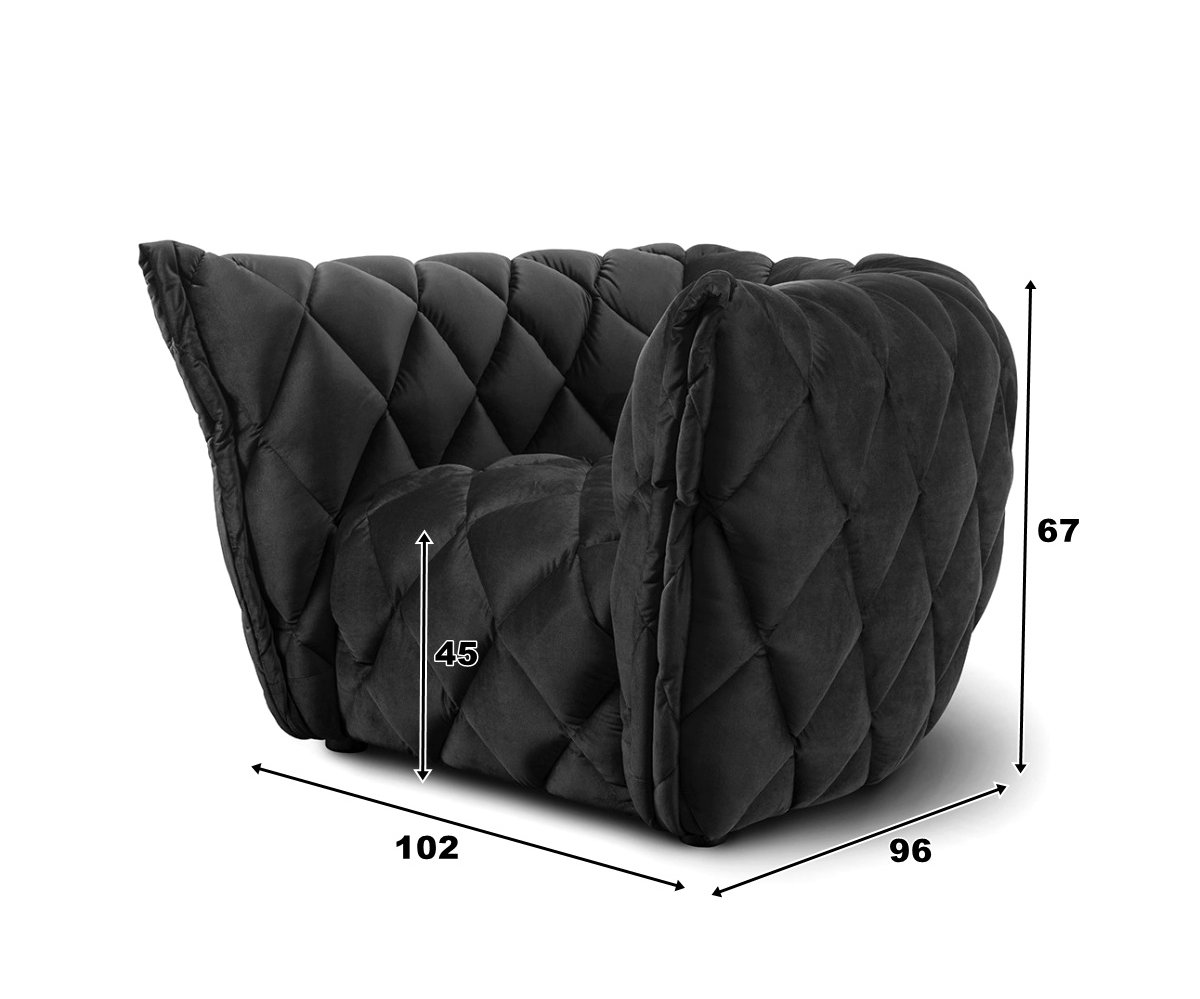 Designové prošívání do kosočtverců a široké, elegantně tvarované područky zaujmou na první pohled.