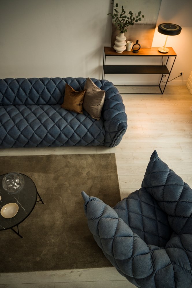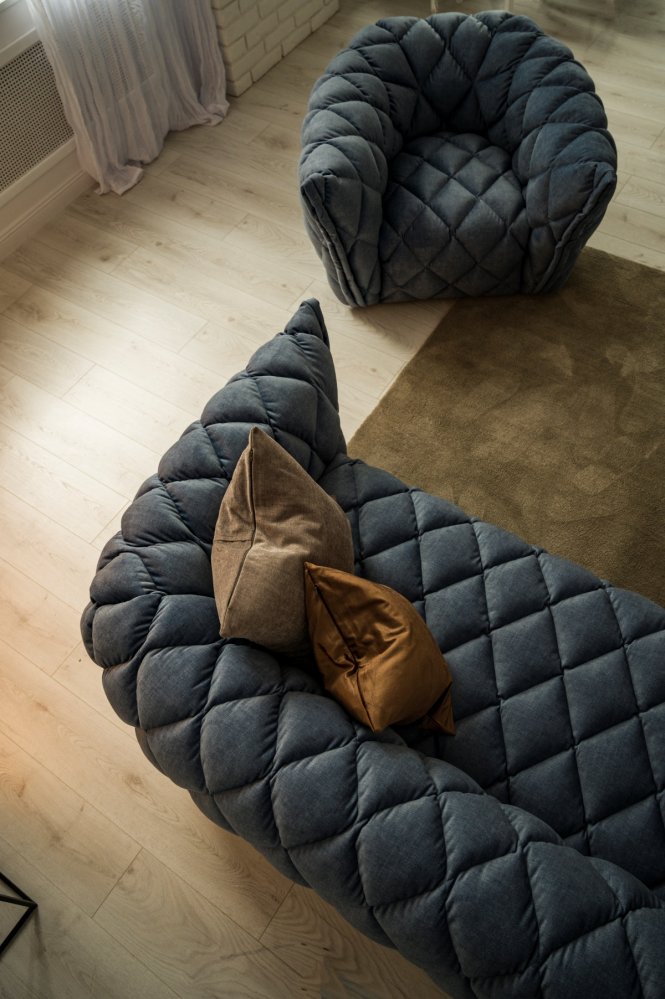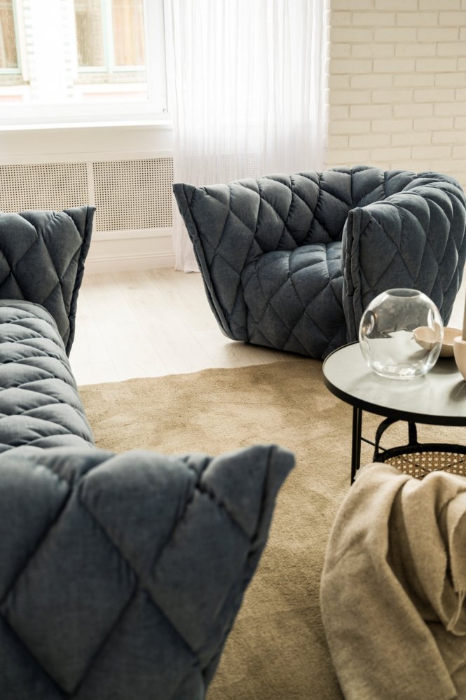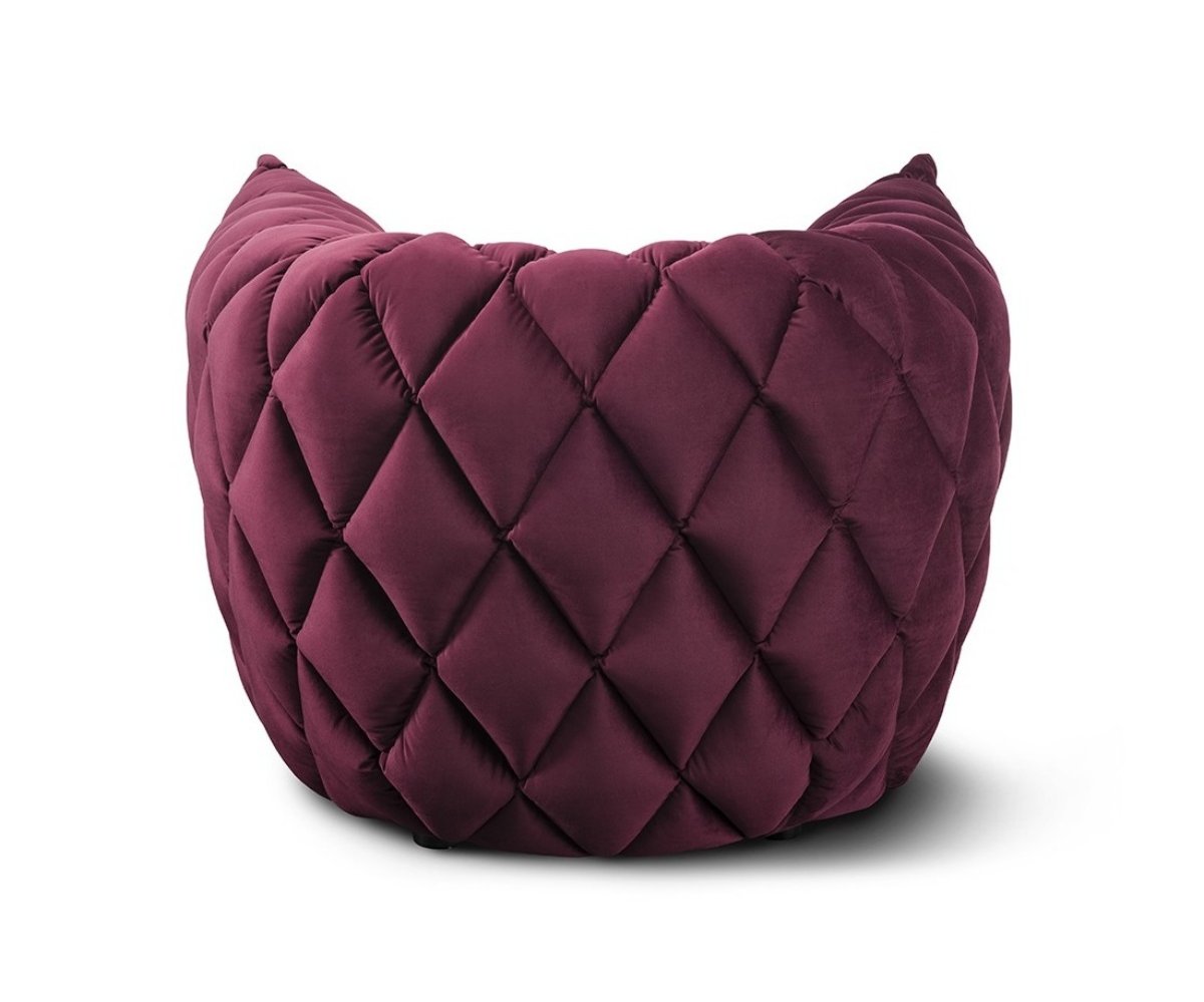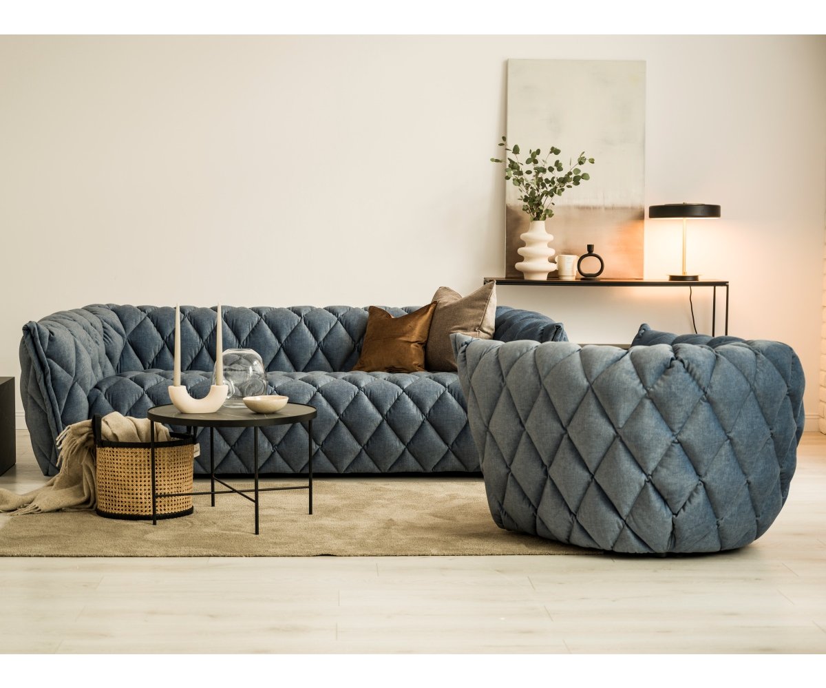 Designové prošívání do kosočtverců a široké, elegantně tvarované područky zaujmou na první pohled.