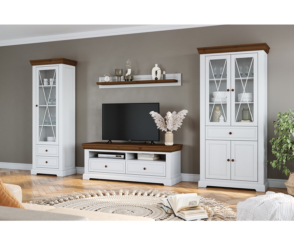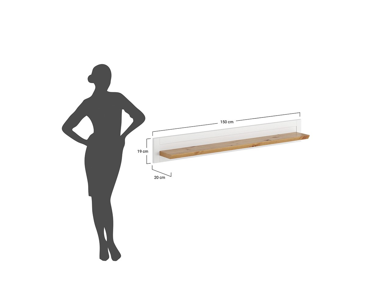 Elegantní nástěnná police RONE je stylovým a funkčním doplňkem každého interiéru inspirovaného venkovem. Kombinace bílé barvy s přírodním borovicovým prvkem vytváří příjemnou rovnováhu mezi moderní čistotou a rustikálním charakterem.