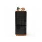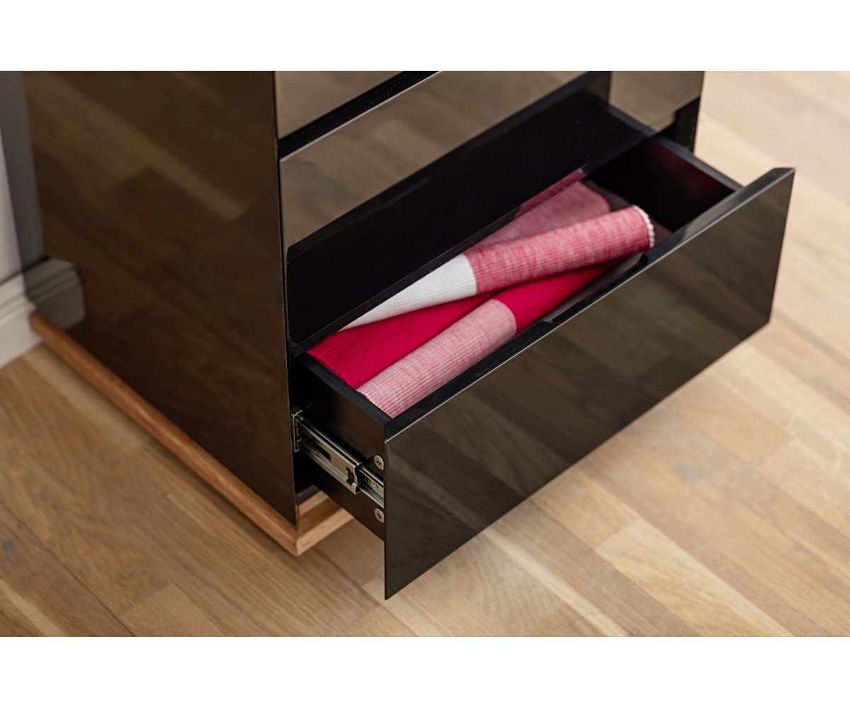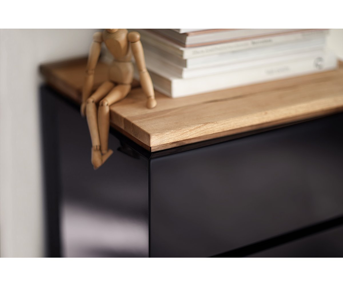 Korpus i zásuvky jsou lakované v bílé matné variantě nebo v černém provedení s vysokým leskem. Horní deska a sokl jsou vyrobeny z masivního dubu s přirozenou kresbou suků, povrchově upraveného olejem, který zvýrazňuje strukturu dřeva a dodává komodě hřejivý přírodní akcent. Bezúchytkové provedení podtrhuje čistý a minimalistický vzhled celé kolekce.