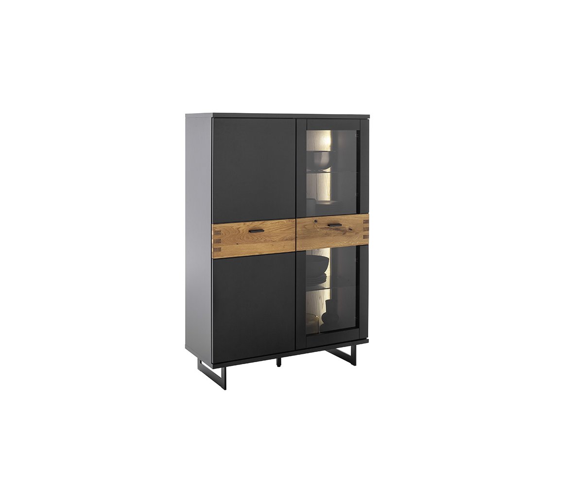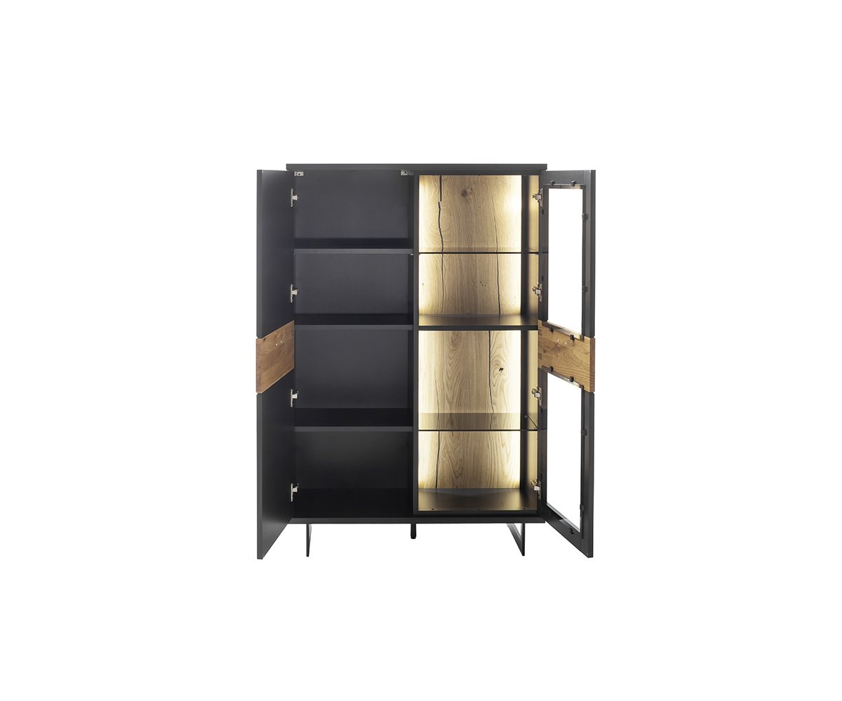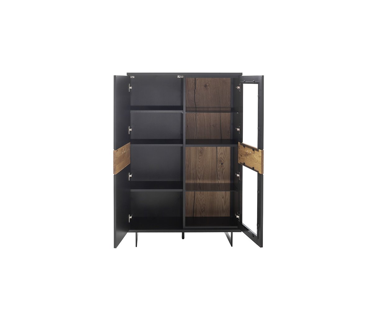 Korpus komody je zpracován v matném černošedém laku, který působí sofistikovaně a snadno se kombinuje s ostatním nábytkem. Dvířka jsou doplněna o aplikaci s dekorem divokého dubu, olejovanou pro zvýraznění přirozené struktury dřeva a teplého vzhledu.