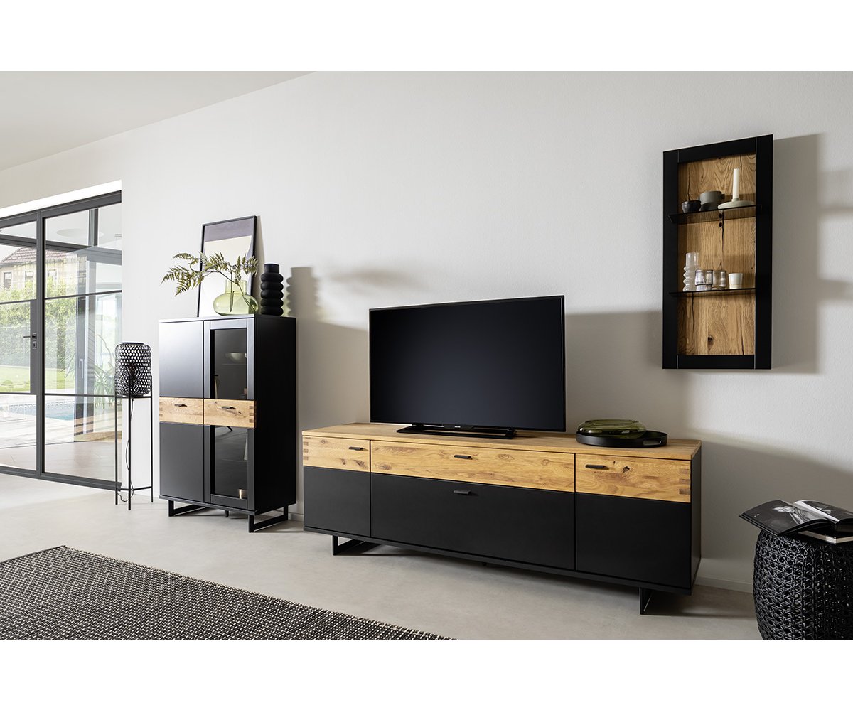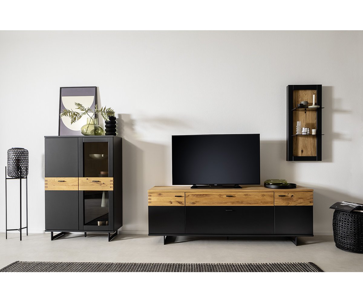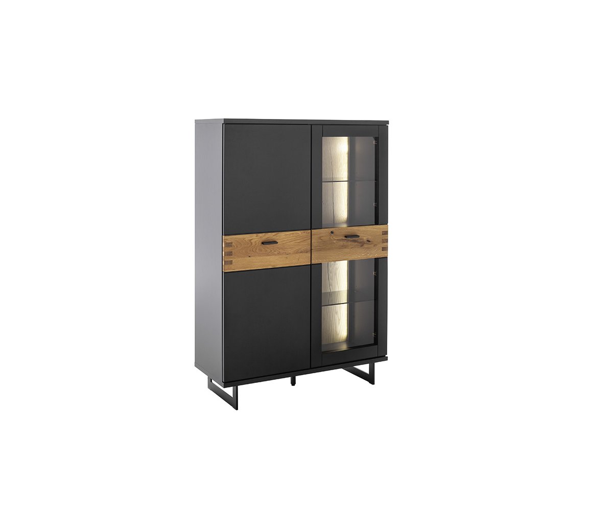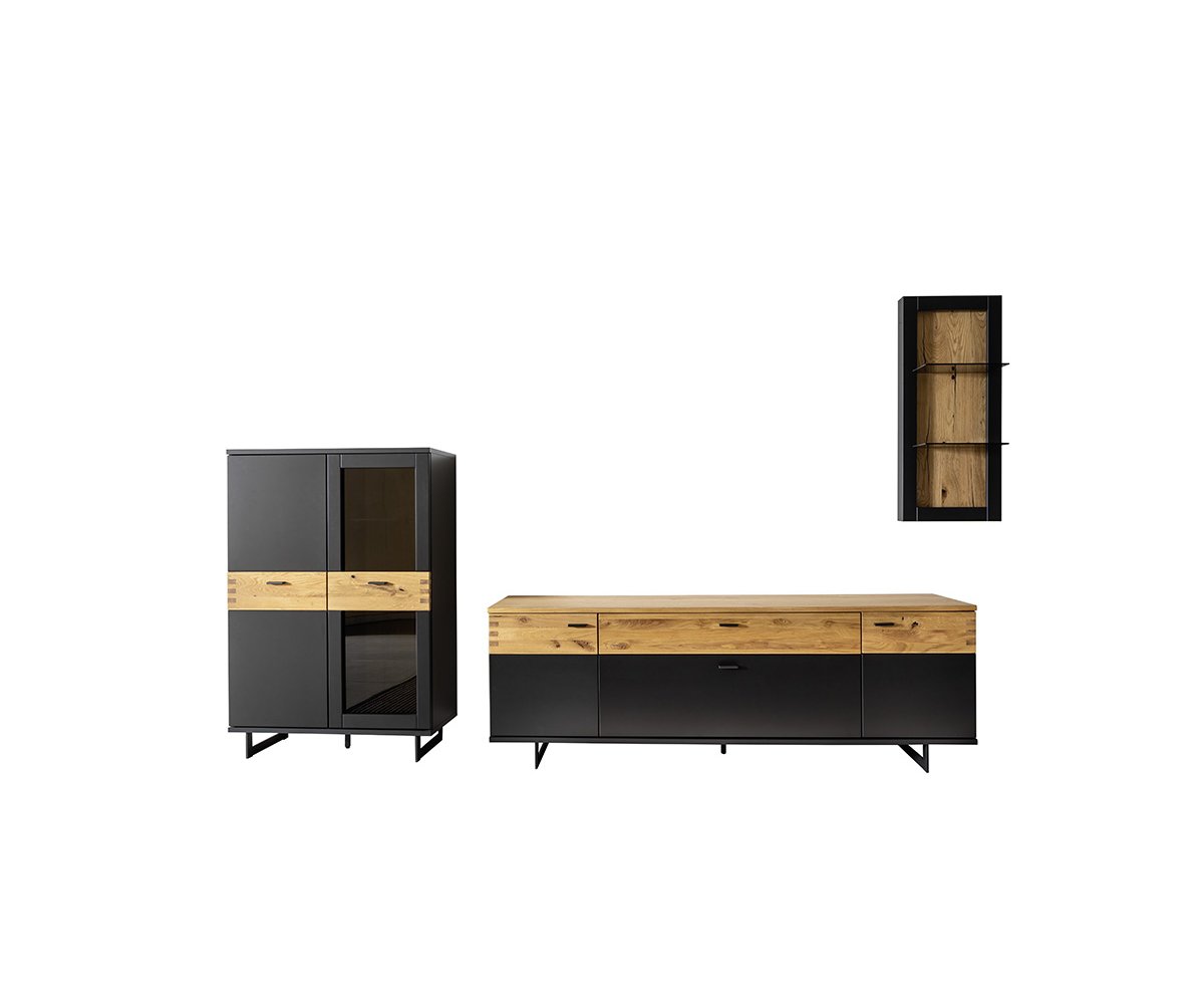 Korpus komody je zpracován v matném černošedém laku, který působí sofistikovaně a snadno se kombinuje s ostatním nábytkem. Dvířka jsou doplněna o aplikaci s dekorem divokého dubu, olejovanou pro zvýraznění přirozené struktury dřeva a teplého vzhledu.