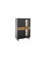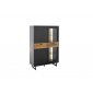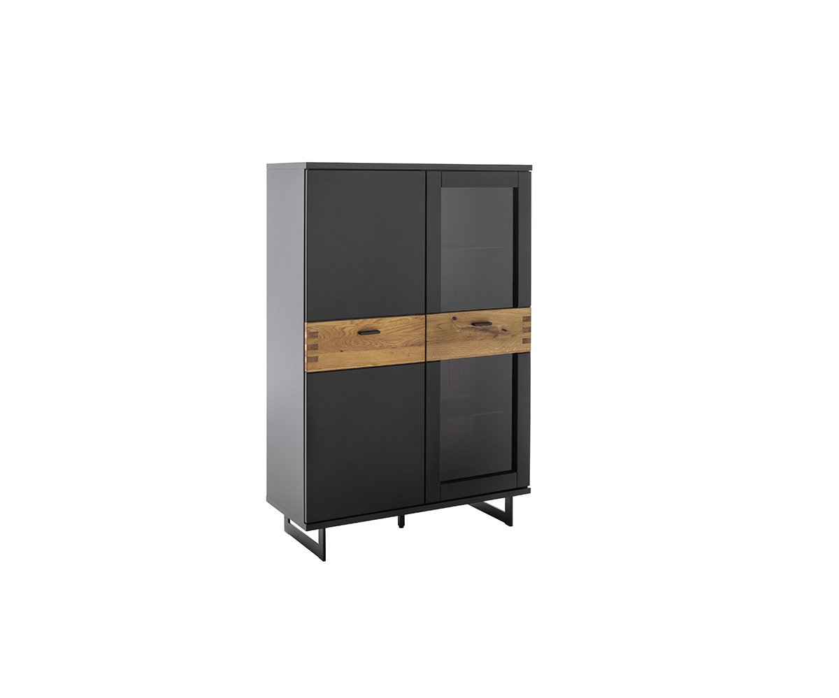 Komoda nabízí jedno plné dvířko a jedno dvířko se sklem, což umožňuje přehledné uložení i decentní vystavení dekorací nebo doplňků. Stabilitu a moderní charakter podtrhují kovové nohy a úchyty v černošedém matném provedení.