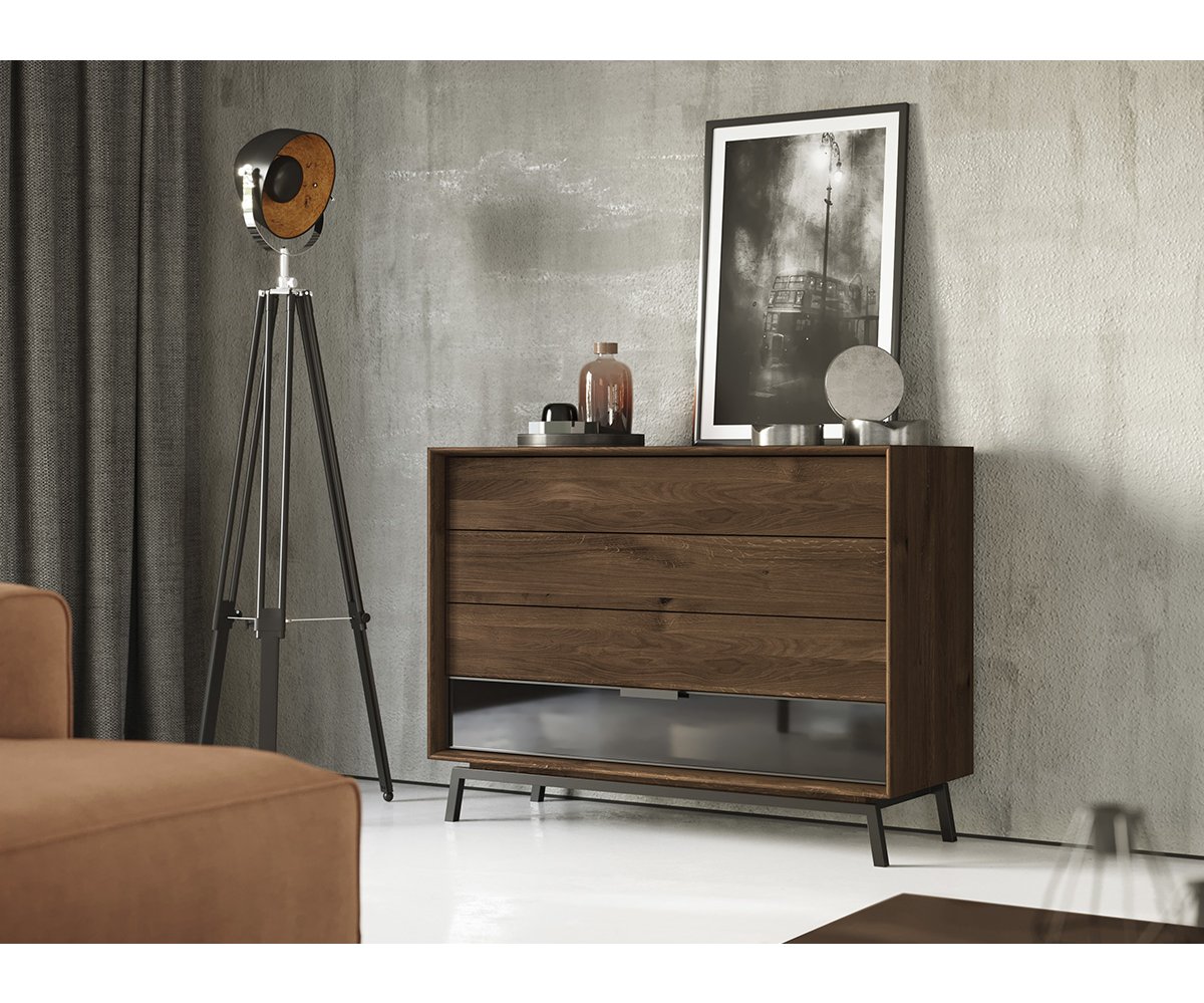 Televizní komoda LOFT z kolekce Loft tabacco od značky Katmandu propojuje moderní industriální styl s přirozenou krásou masivního dřeva.