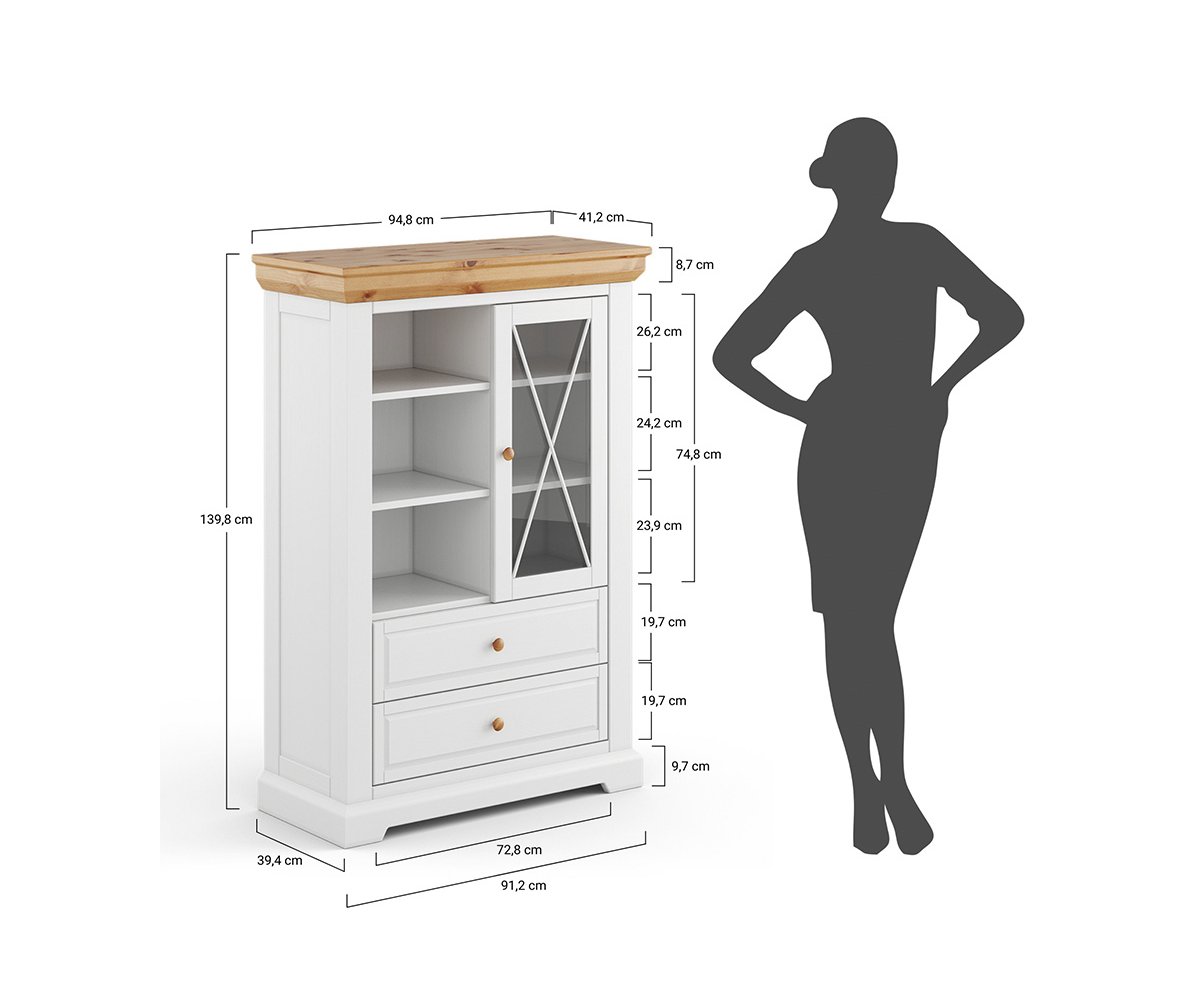 Komoda s vitrínou RONE v sobě spojuje praktické úložné prostory s elegantní prezentací dekorací nebo nádobí. Vyniká klasickým venkovským designem, který přinese do vašeho interiéru pocit klidu a harmonie.