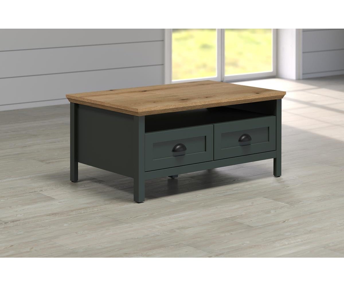 Elegantní konferenční stolek z kolekce STANTON je praktickým doplňkem k obývací sestavě a zároveň stylovým prvkem, který dotváří celkový vzhled interiéru. Kombinace tmavě zelených ploch s dekorem dřeva dub Evoke vytváří stylový kontrast, který působí nadčasově a zároveň velmi útulně.