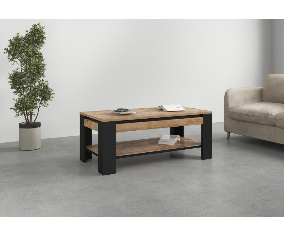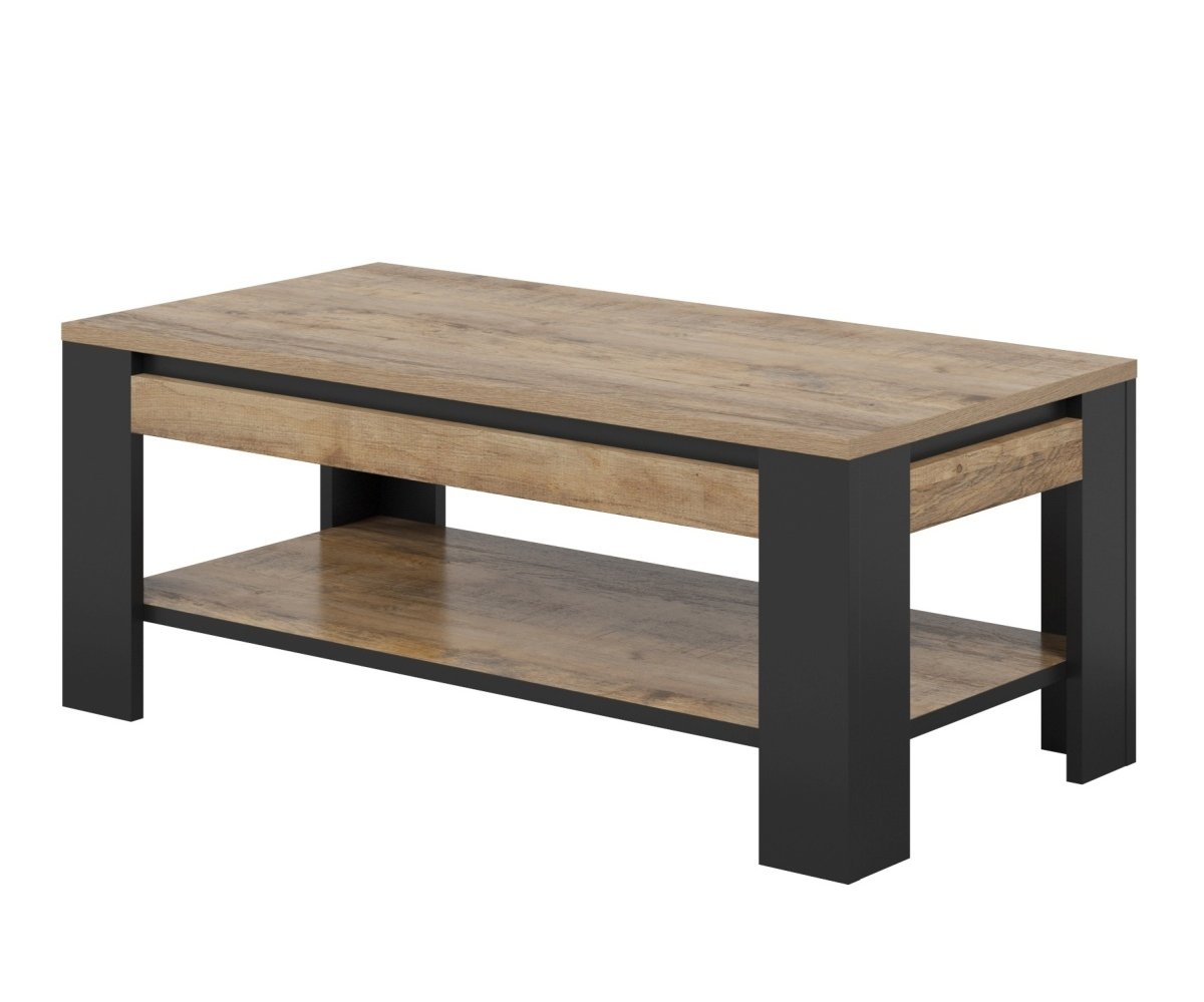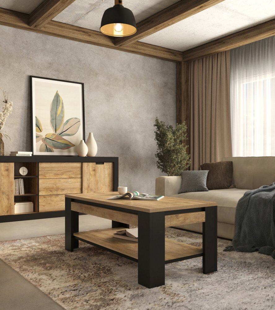 Konferenční stolek TUDOR v dekoru dub Samdal a černý mat je stylový a praktický doplněk, který zvýrazní industriální charakter vašeho obývacího pokoje a zároveň nabídne funkční odkládací prostor.