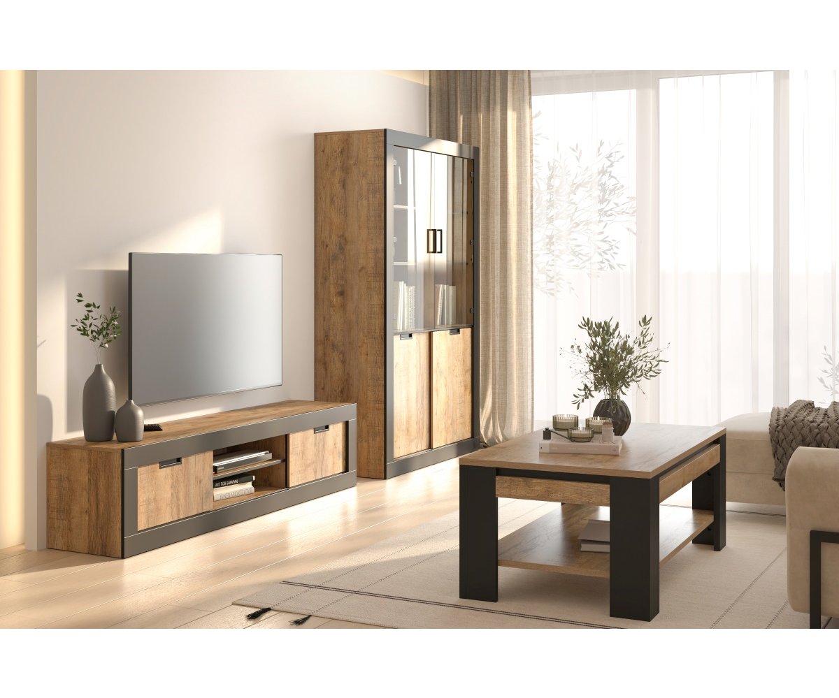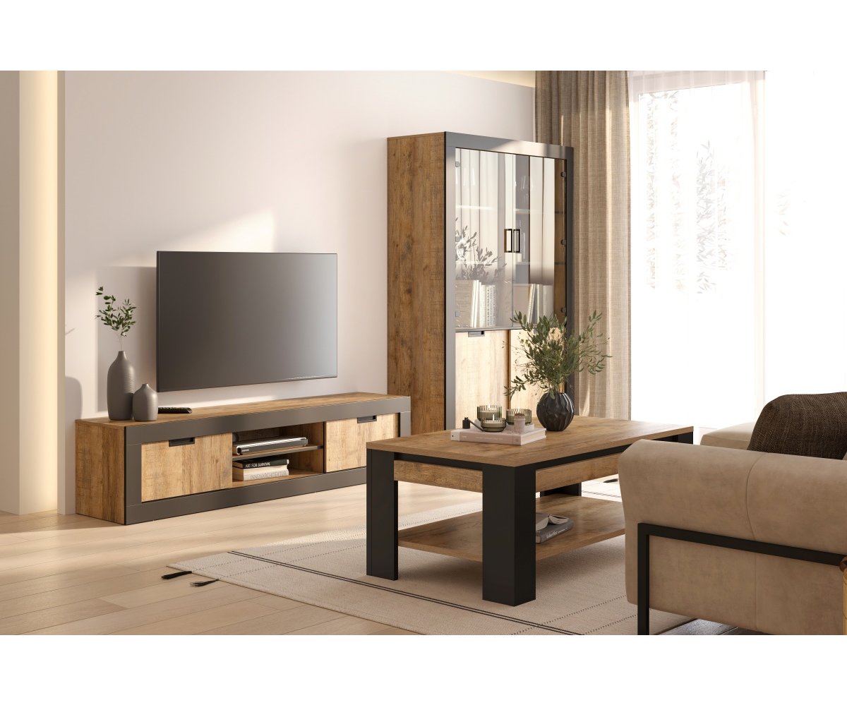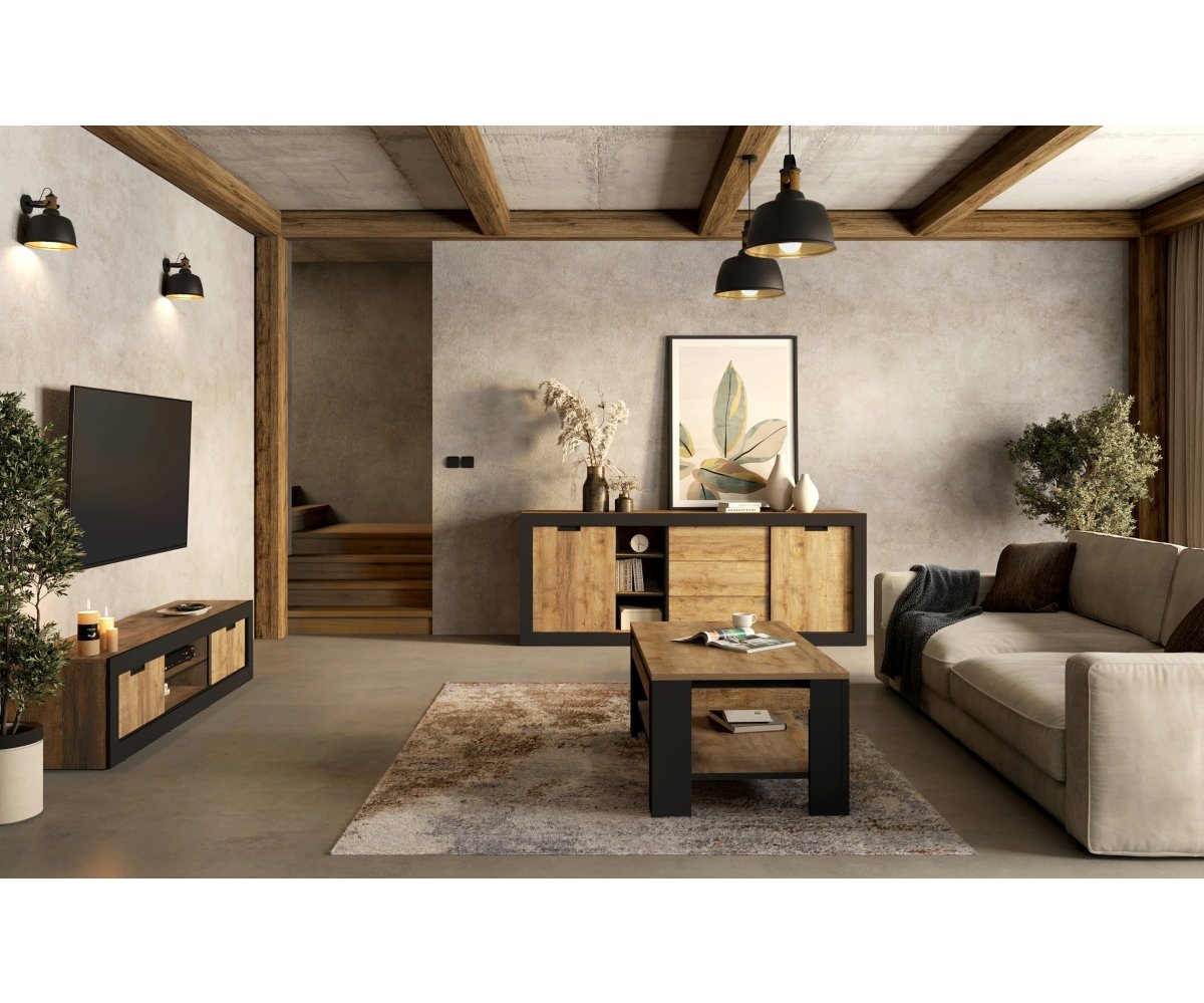 Konferenční stolek TUDOR v dekoru dub Samdal a černý mat je stylový a praktický doplněk, který zvýrazní industriální charakter vašeho obývacího pokoje a zároveň nabídne funkční odkládací prostor.