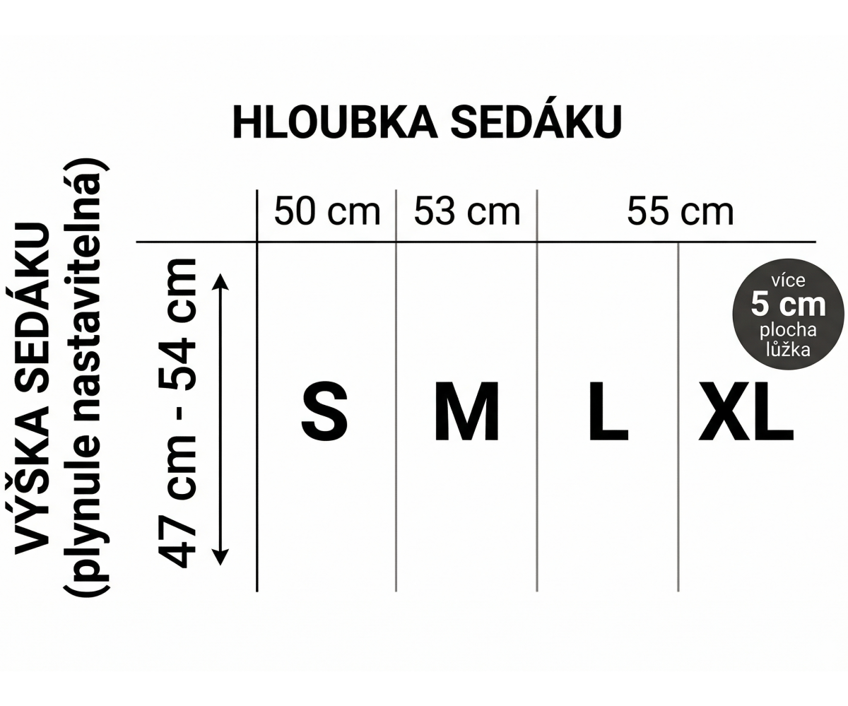 Křeslo si můžete přizpůsobit na míru Vaší postavě - zvolit si můžete z plynule nastavitelných výšek sezení 47 - 54 cm a hloubku sedáku vybrat v rozměru 50, 53 nebo 55 cm. K dispozici je také velikost křesla XL, kde je délka ležení prodloužena o cca 5 cm.