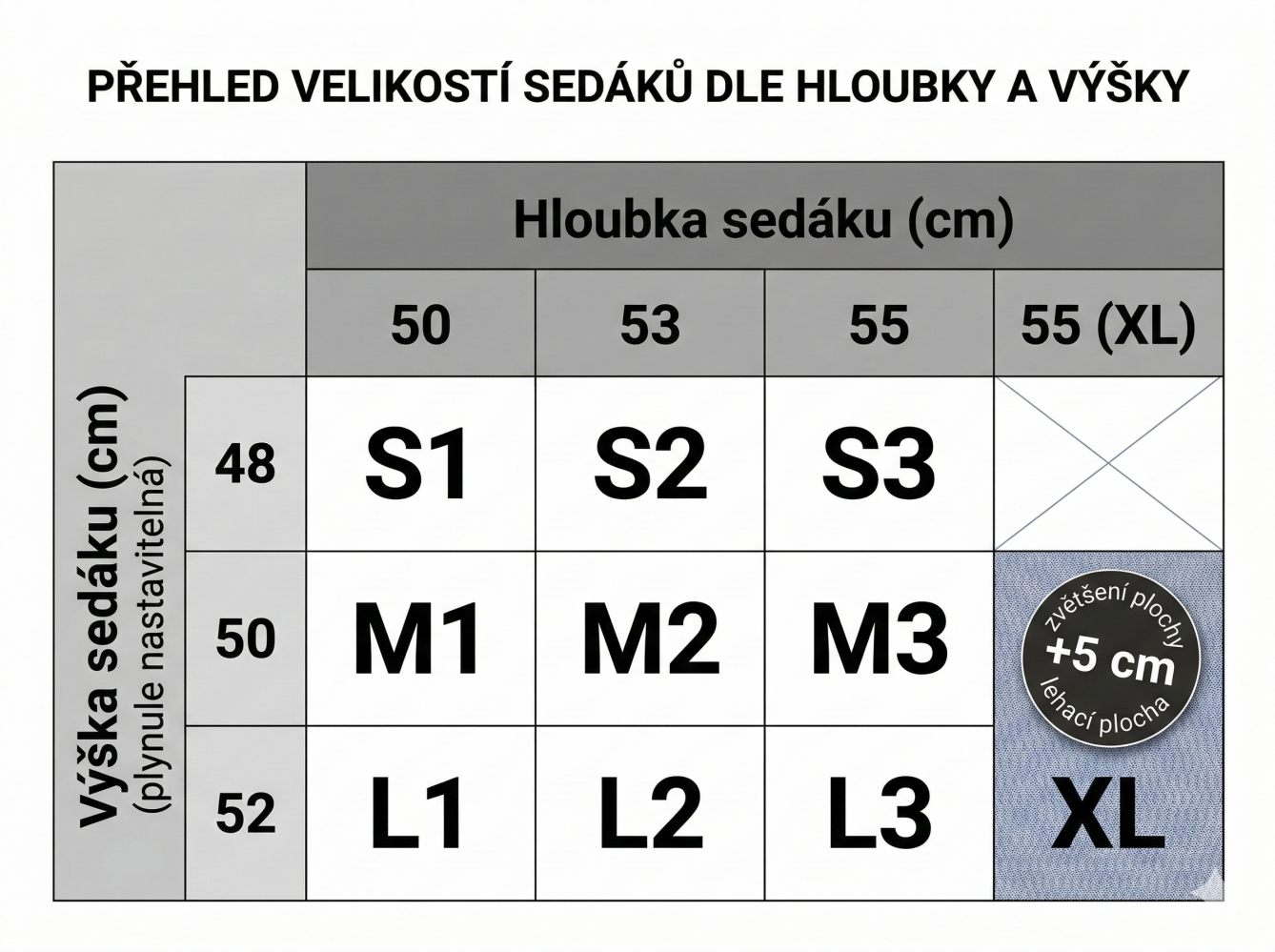 Křeslo si můžete přizpůsobit na míru Vaší postavě - zvolit si můžete ze tří výšek sezení 47, 49 a 51 cm a hloubku sedáku vybrat v rozměru 50, 53 nebo 55 cm. K dispozici je také velikost křesla XL, kde je délka ležení prodloužena o cca 5 cm. Tento model jako jediný v naší nabídce nabízí zvýšenou nosnost do 200 Kg.
