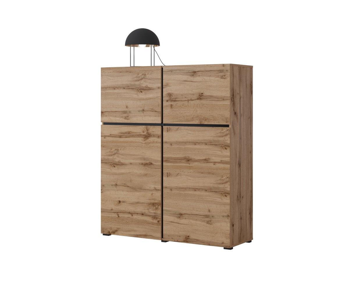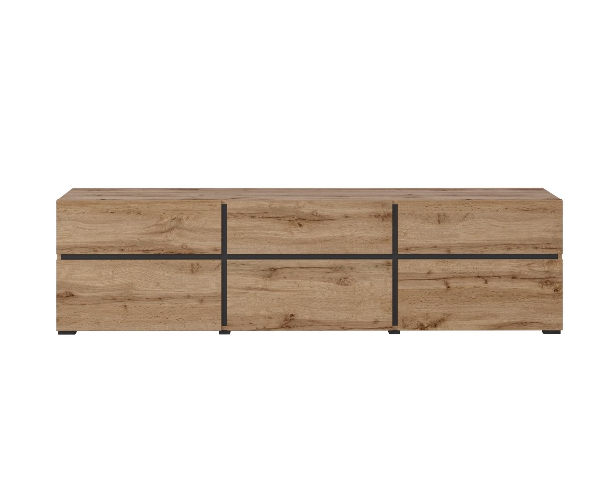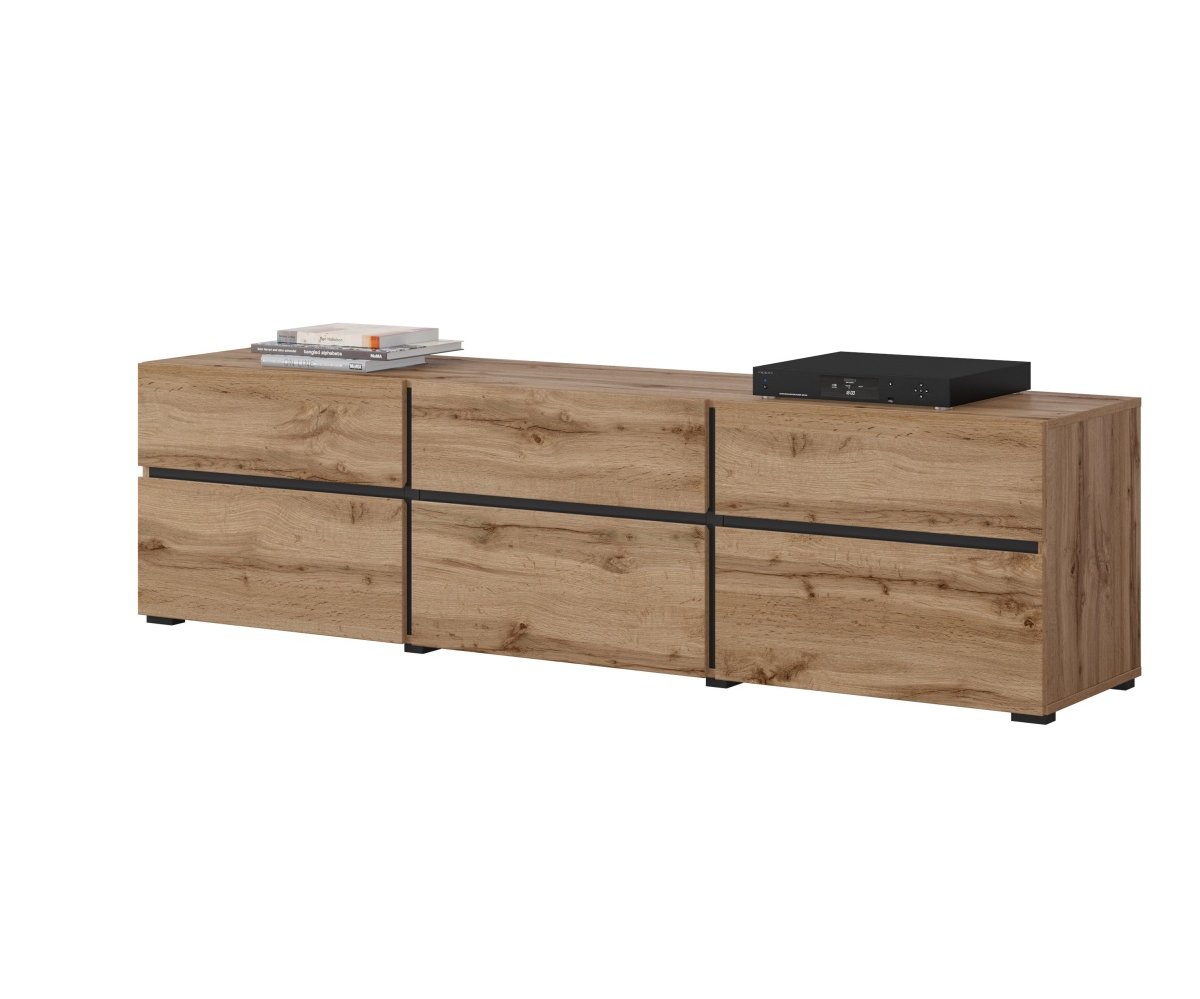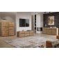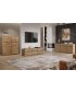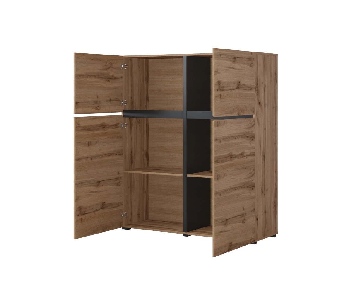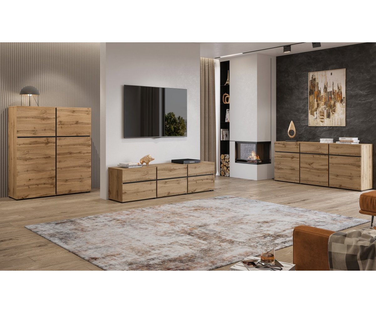 Elegantní obývací sestava CROSS v teplém přírodním dekoru Dub Wotan doplněná o výrazné černé linie přináší do interiéru harmonii, útulnost a moderní styl. Struktura dřeva je autentická a přirozeně kontrastuje s matnými černými prvky, které dodávají sestavě výraz a eleganci.