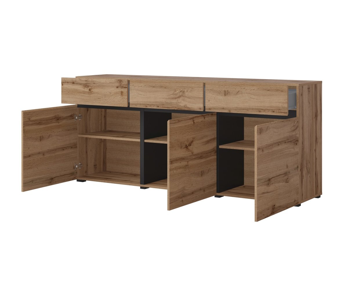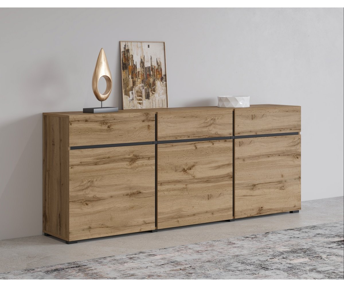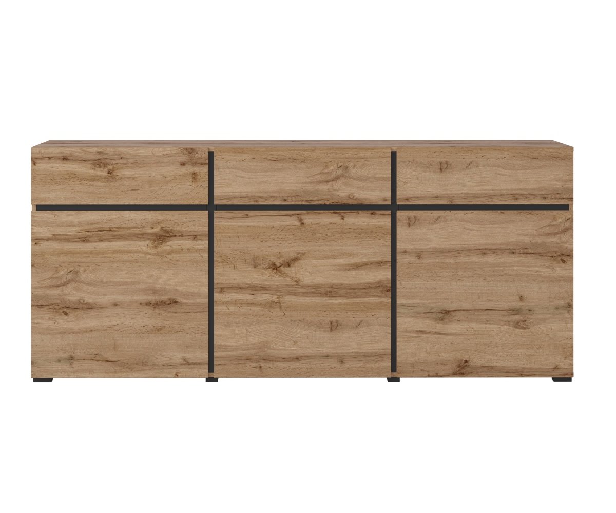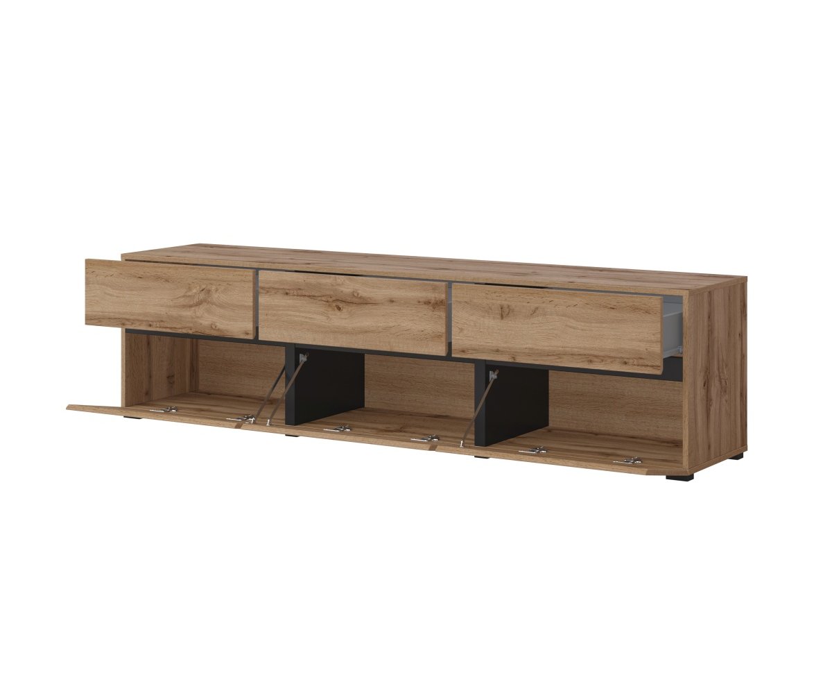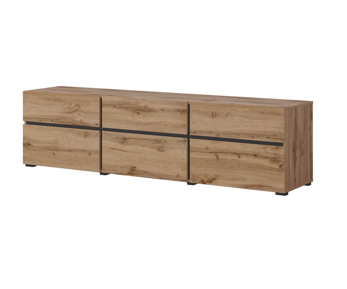 Elegantní obývací sestava CROSS v teplém přírodním dekoru Dub Wotan doplněná o výrazné černé linie přináší do interiéru harmonii, útulnost a moderní styl. Struktura dřeva je autentická a přirozeně kontrastuje s matnými černými prvky, které dodávají sestavě výraz a eleganci.