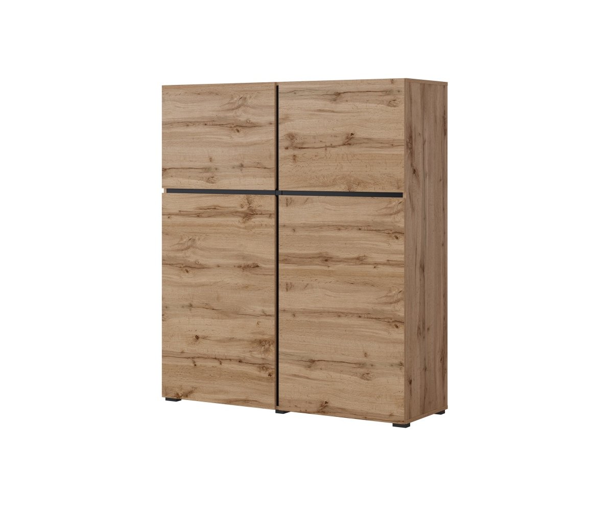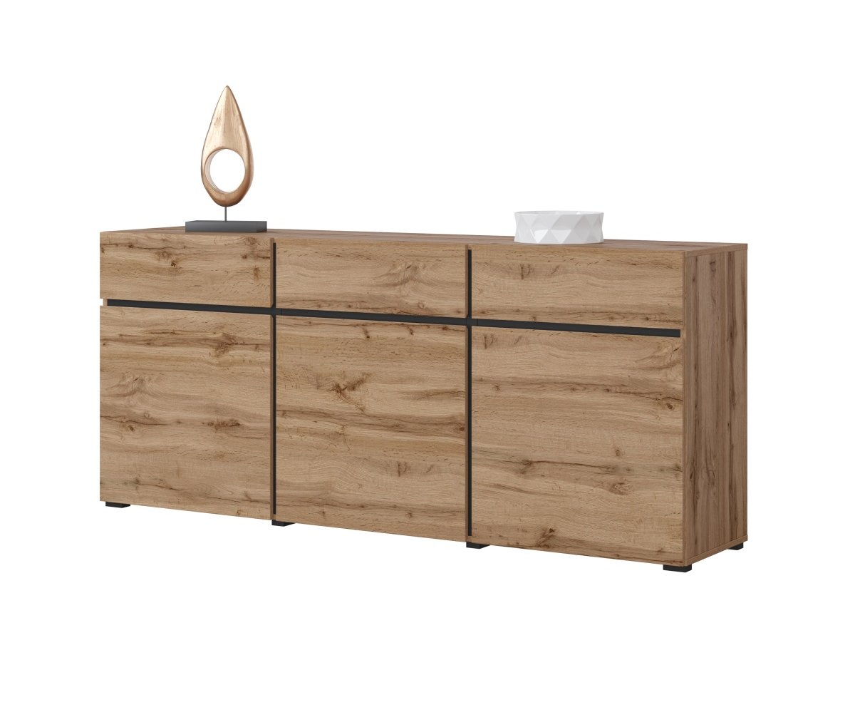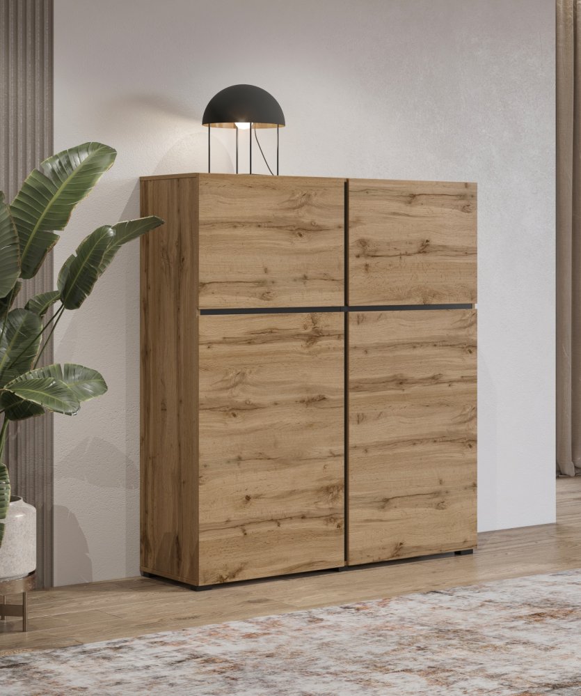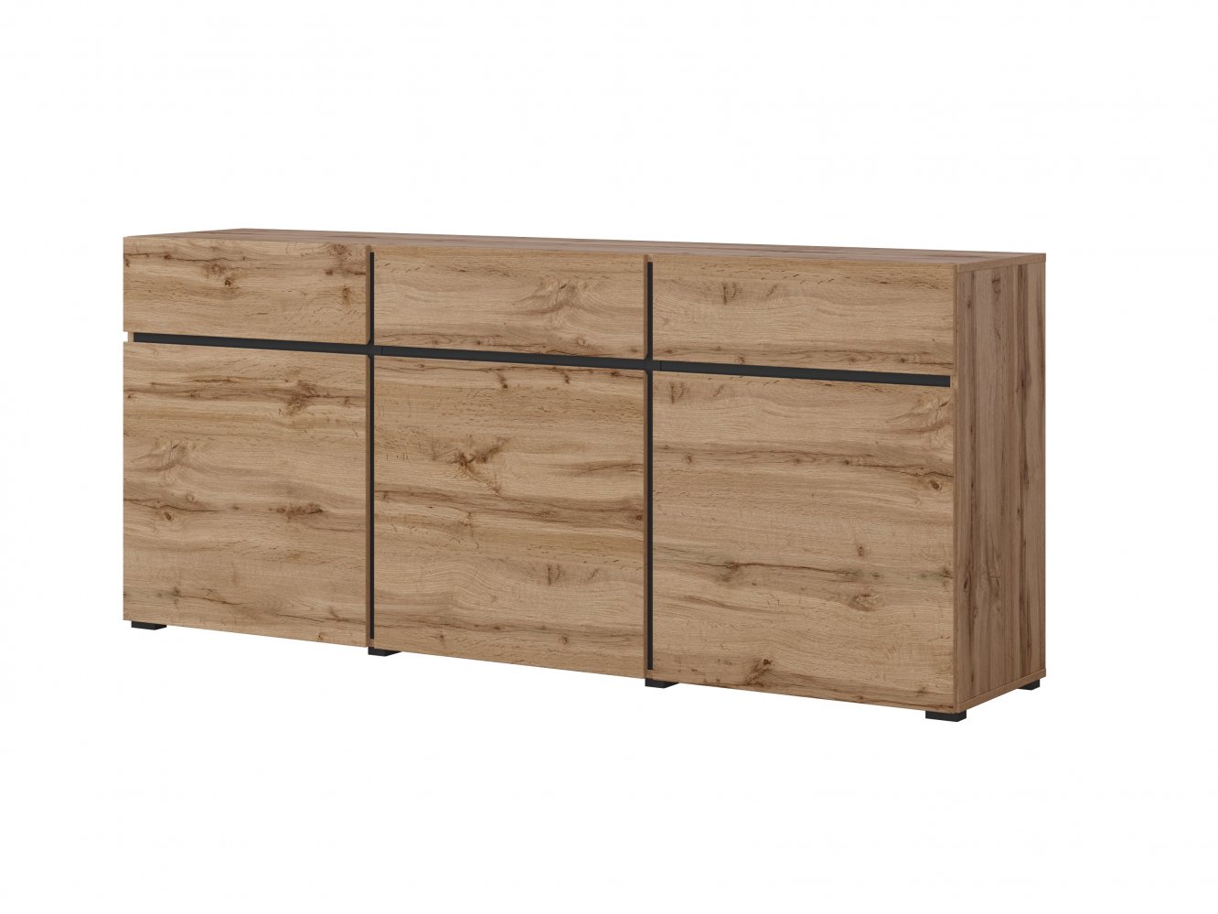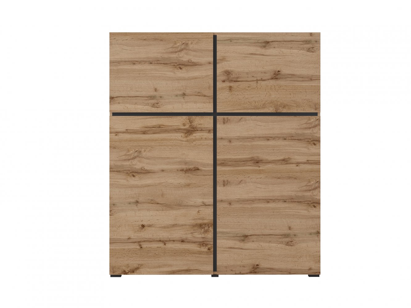Elegantní obývací sestava CROSS v teplém přírodním dekoru Dub Wotan doplněná o výrazné černé linie přináší do interiéru harmonii, útulnost a moderní styl. Struktura dřeva je autentická a přirozeně kontrastuje s matnými černými prvky, které dodávají sestavě výraz a eleganci.