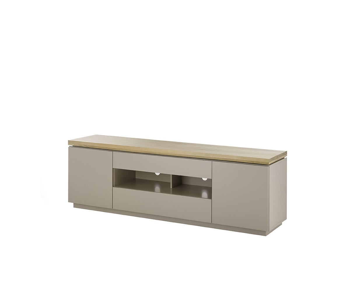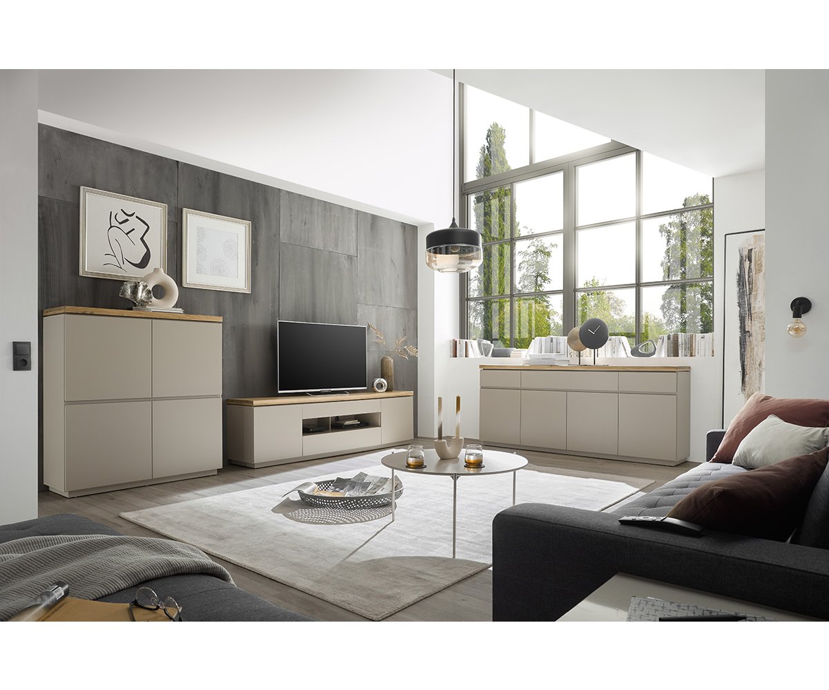 Kolekce obývacího nábytku PALAMOS přináší harmonické spojení moderní elegance a přírodního charakteru. Jemný béžovošedý matný lak působí klidně a nadčasově, zatímco masivní akácie vnáší do interiéru teplo, strukturu a autentický vzhled dřeva. Výsledkem je sestava, která se skvěle hodí do moderních i přírodně laděných obývacích pokojů.