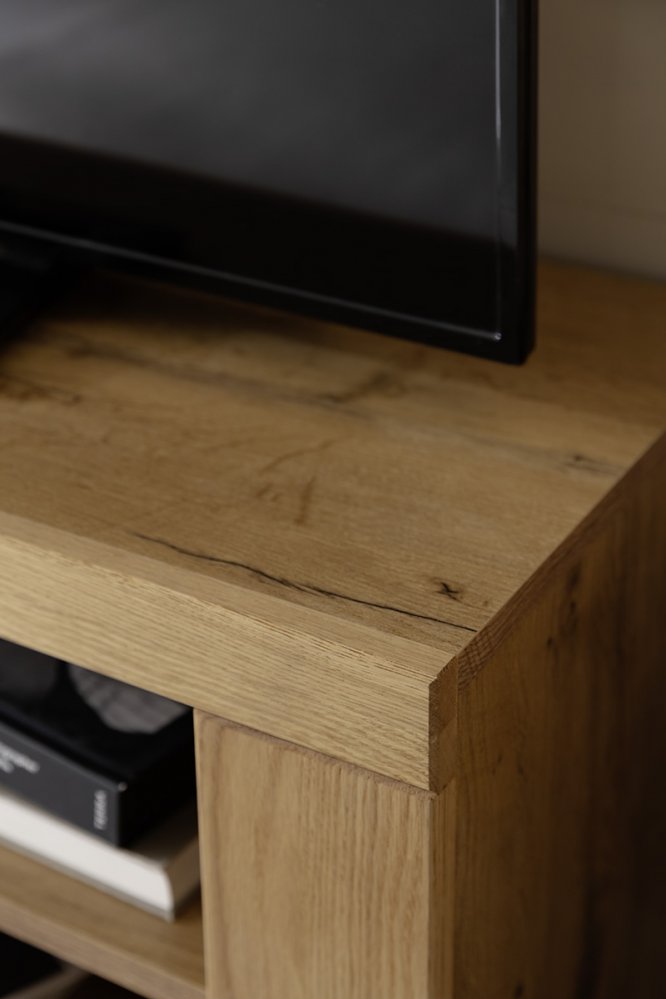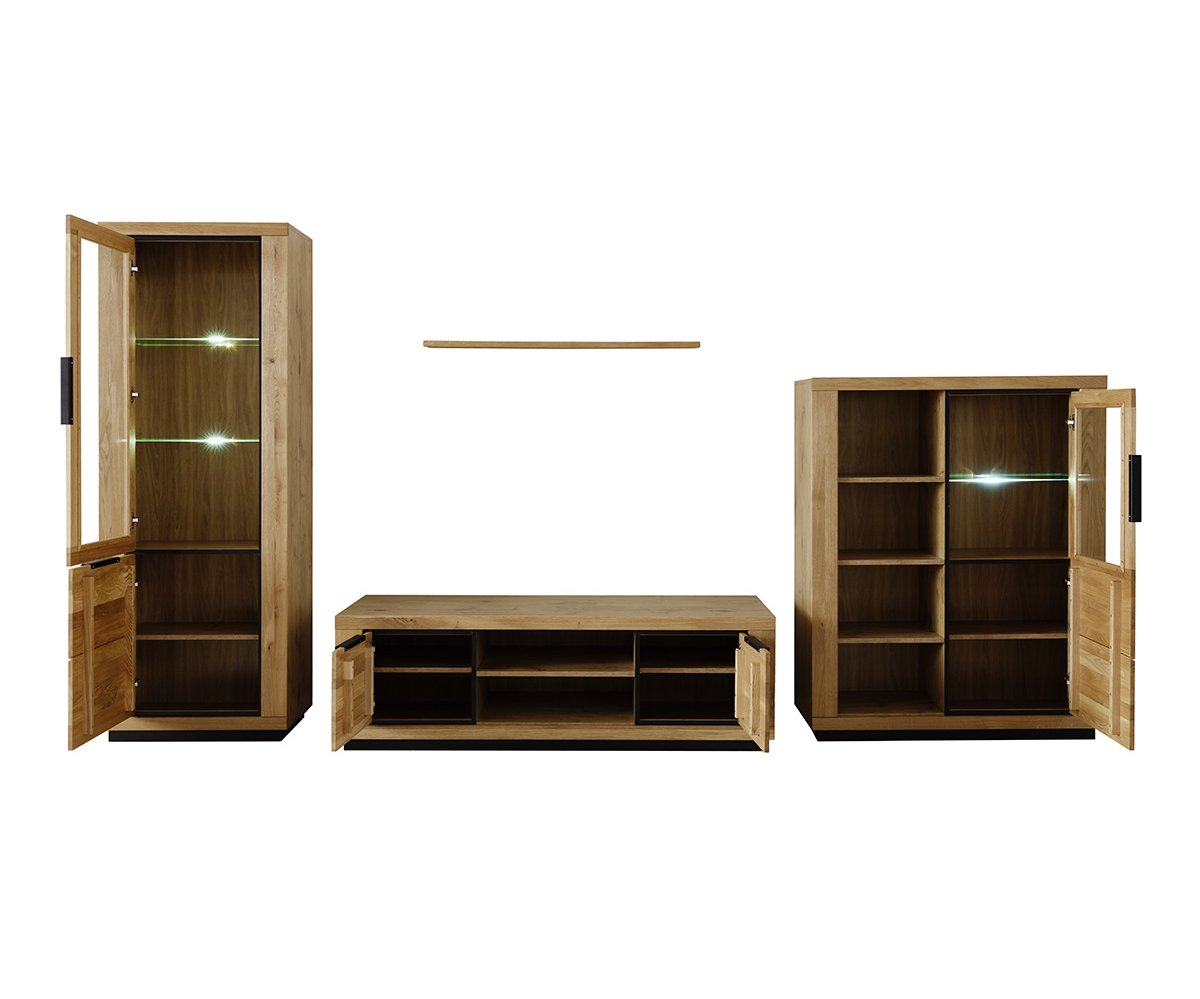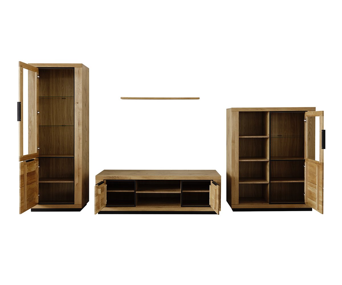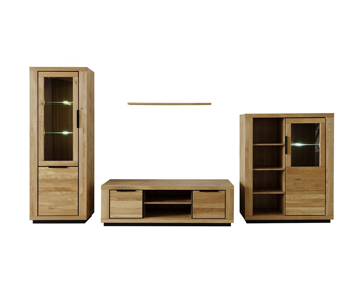 Obývací sestava GRENO představuje harmonické spojení moderního designu a přirozené krásy masivního dubu olejovaného. Čela z masivního dřeva vynikají autentickou kresbou, která činí každý kus nábytku originálem. Korpusy v dekoru dubu ladí s masivními prvky a podtrhují jednotný vzhled celé kolekce.