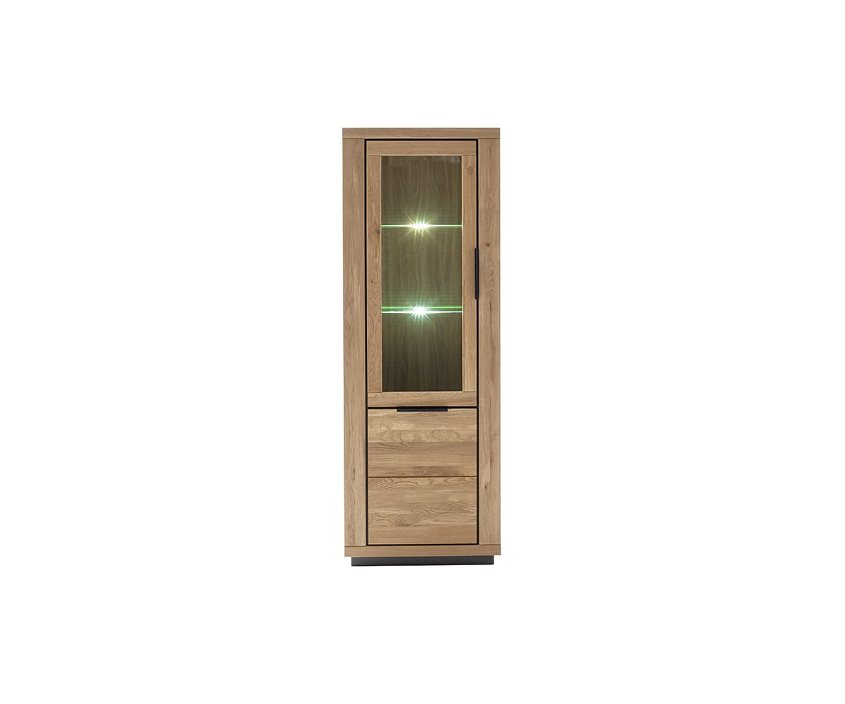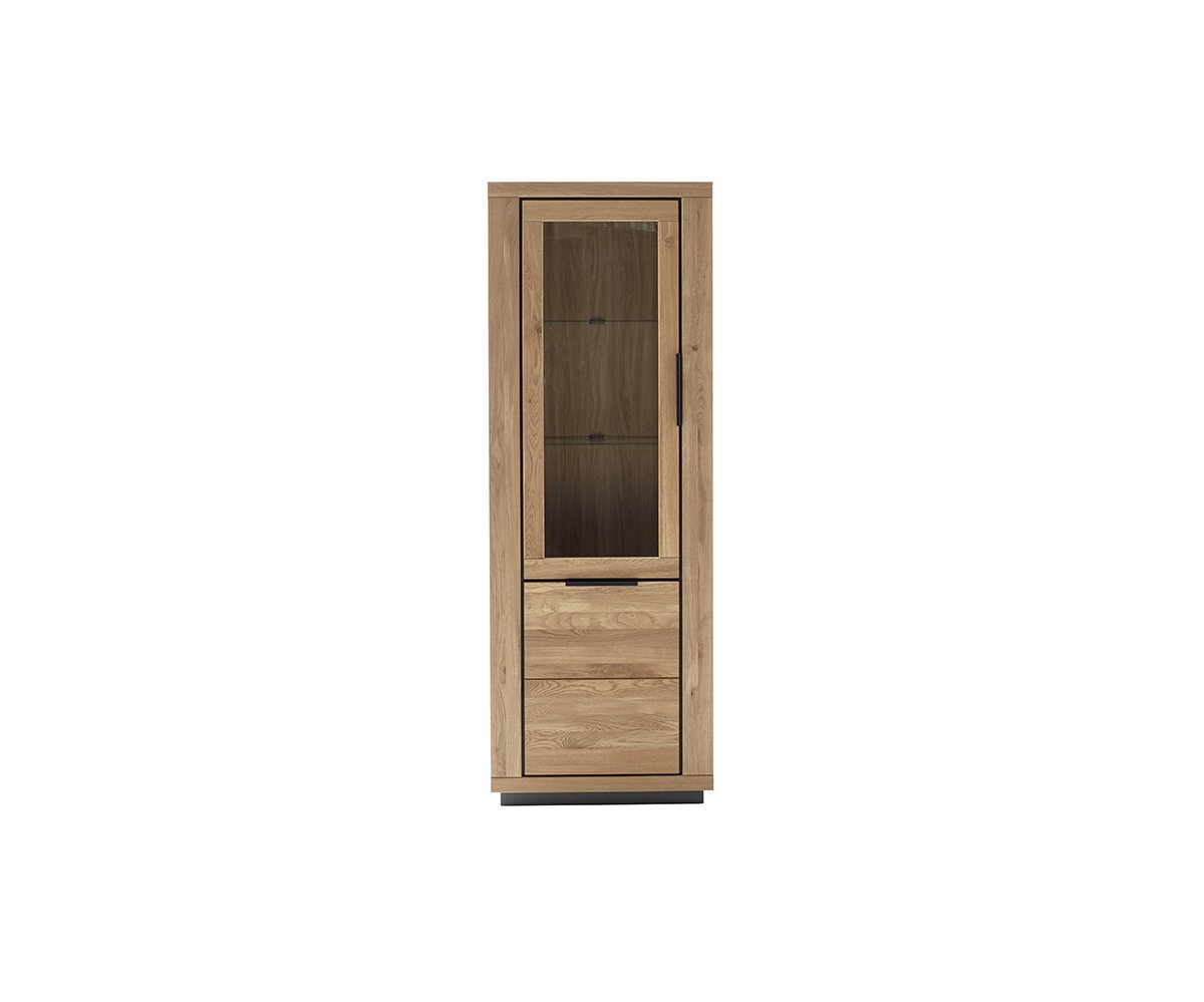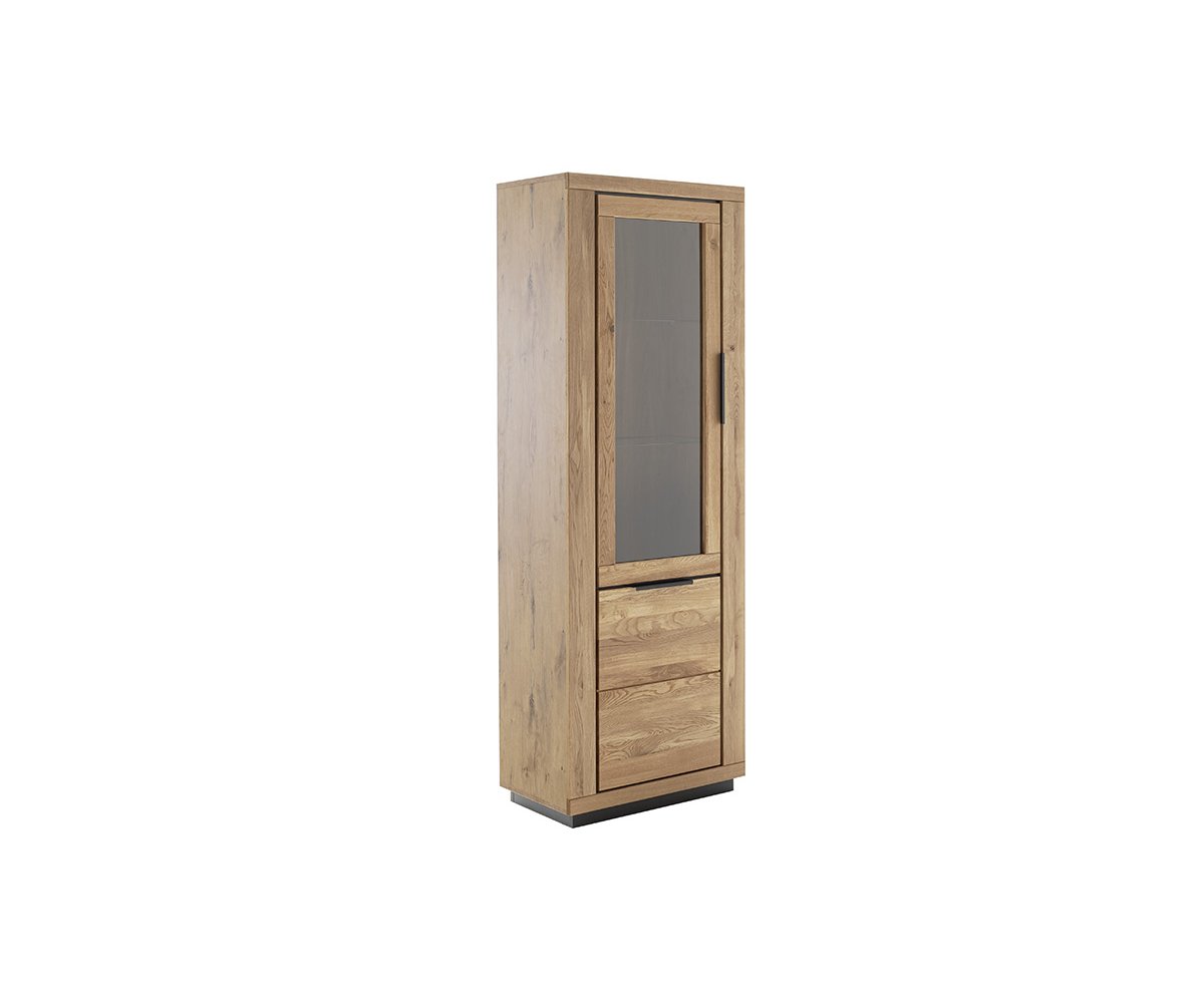 GRE14T10 – Vitrína levá, 2dveřová Rozměry: 72 × 40 × 200 cm (š × h × v) Korpus v dekoru dubu, čela z masivního dubu olejovaného