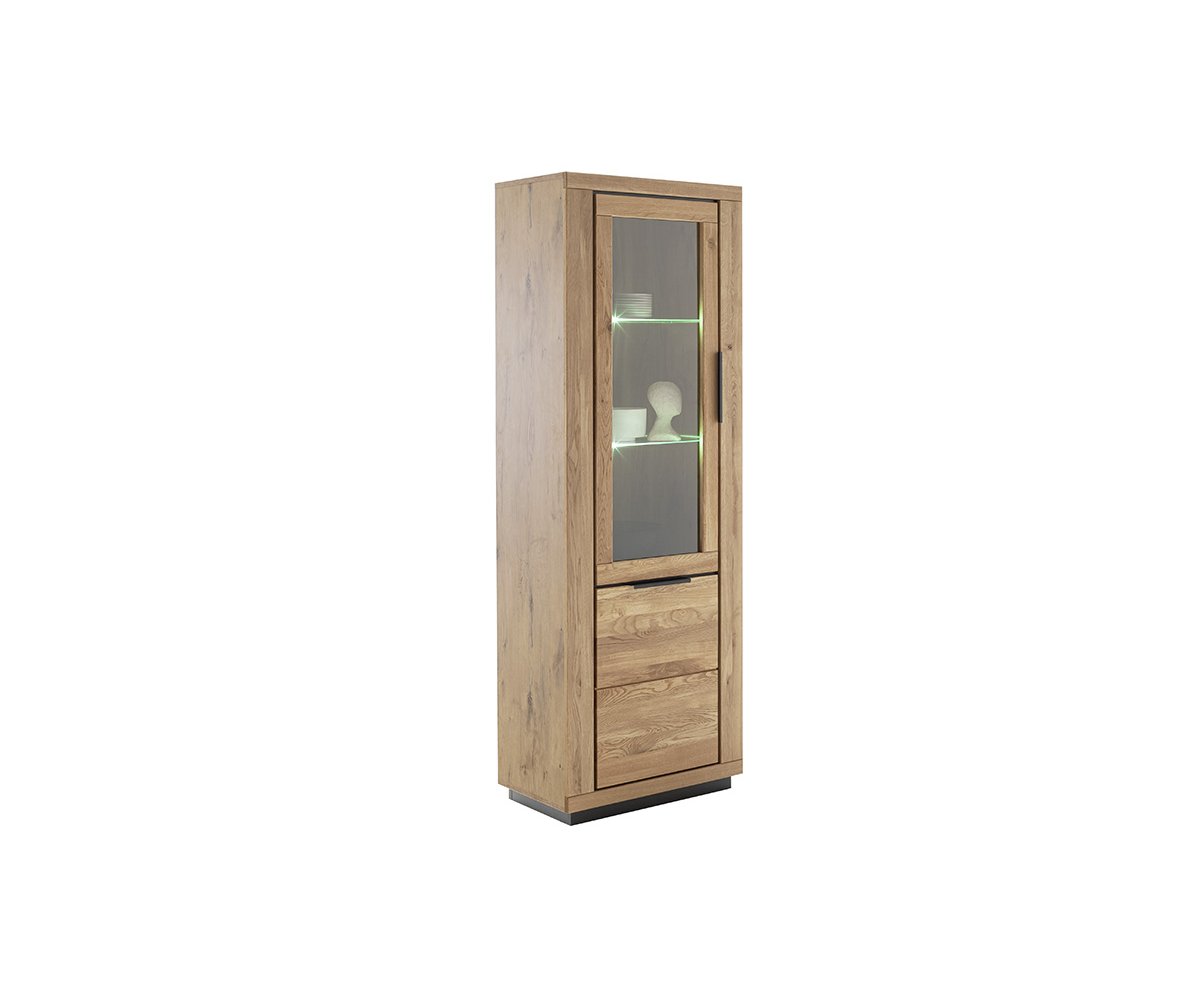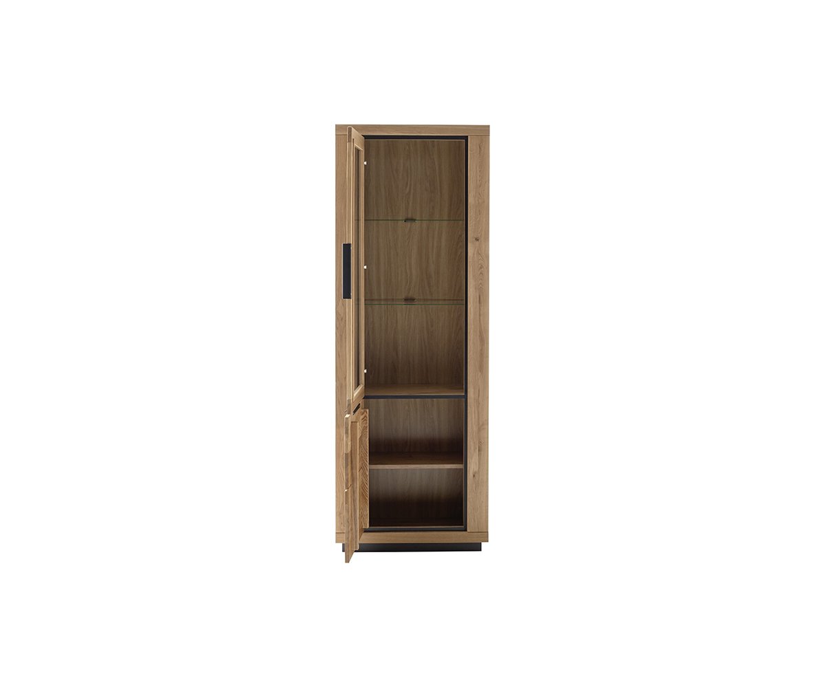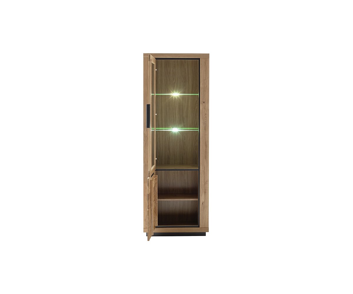 GRE14T10 – Vitrína levá, 2dveřová Rozměry: 72 × 40 × 200 cm (š × h × v) Korpus v dekoru dubu, čela z masivního dubu olejovaného