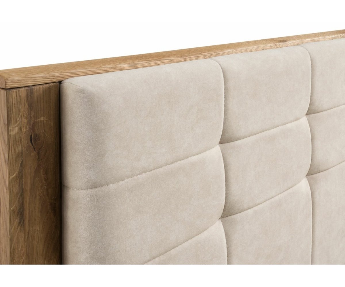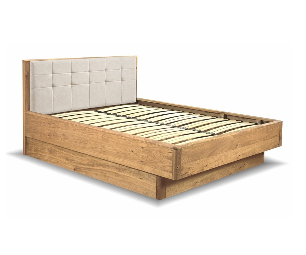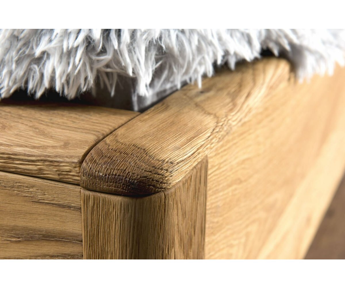 Dubová postel z kolekce DENVER s čalouněným čelem, vyklápěcím roštem a úložným prostorem. Postel je vyrobena z masivu a přírodní dýhy. Dřevěné části nábytku jsou ošetřeny přírodním voskem a olejem. Povrch dřeva je upraven kartáčováním - není hladký, při dotyku je krásně cítit struktura dubového dřeva.