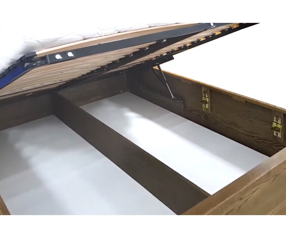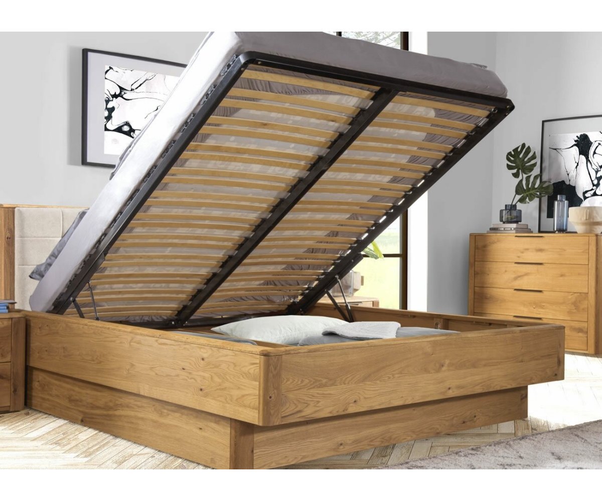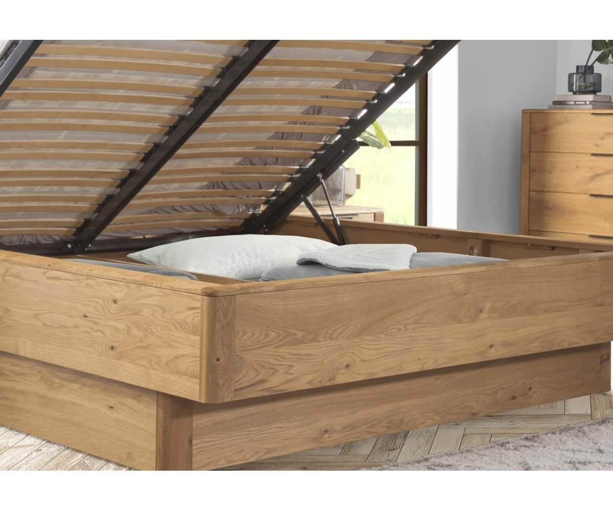 Dubová postel z kolekce DENVER s čalouněným čelem, vyklápěcím roštem a úložným prostorem. Postel je vyrobena z masivu a přírodní dýhy. Dřevěné části nábytku jsou ošetřeny přírodním voskem a olejem. Povrch dřeva je upraven kartáčováním - není hladký, při dotyku je krásně cítit struktura dubového dřeva.