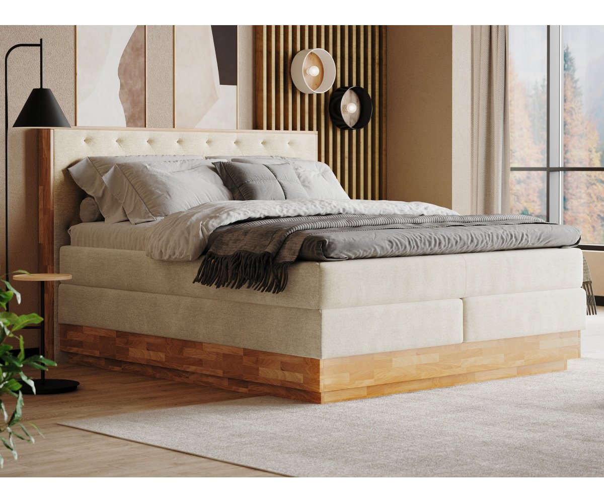 Kvalitní postel boxspring včetně luxusní 7-zónové taštičkové matrace promění ranní vstávání v radost, která Vás bude provázet po celý den. U postele oceníte vysoký komfort ležení a nadstandardní výšku spaní. Příjemně měkké designové čelo v dřevěném rámu přidává přírodní a luxusní dotek do ložnice.
