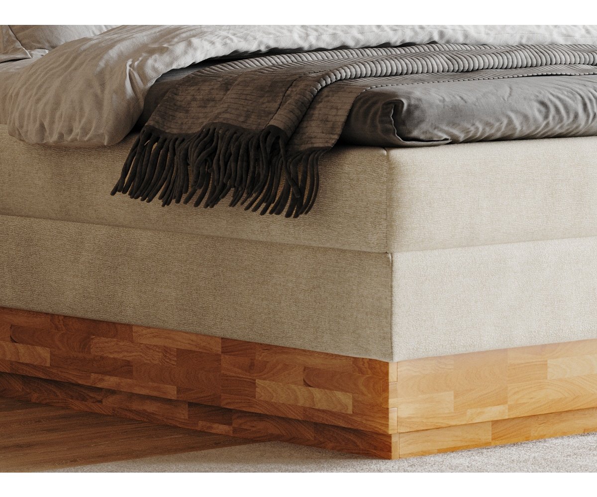 Kvalitní postel boxspring včetně luxusní 7-zónové taštičkové matrace promění ranní vstávání v radost, která Vás bude provázet po celý den. U postele oceníte vysoký komfort ležení a nadstandardní výšku spaní. Příjemně měkké designové čelo v dřevěném rámu přidává přírodní a luxusní dotek do ložnice.