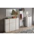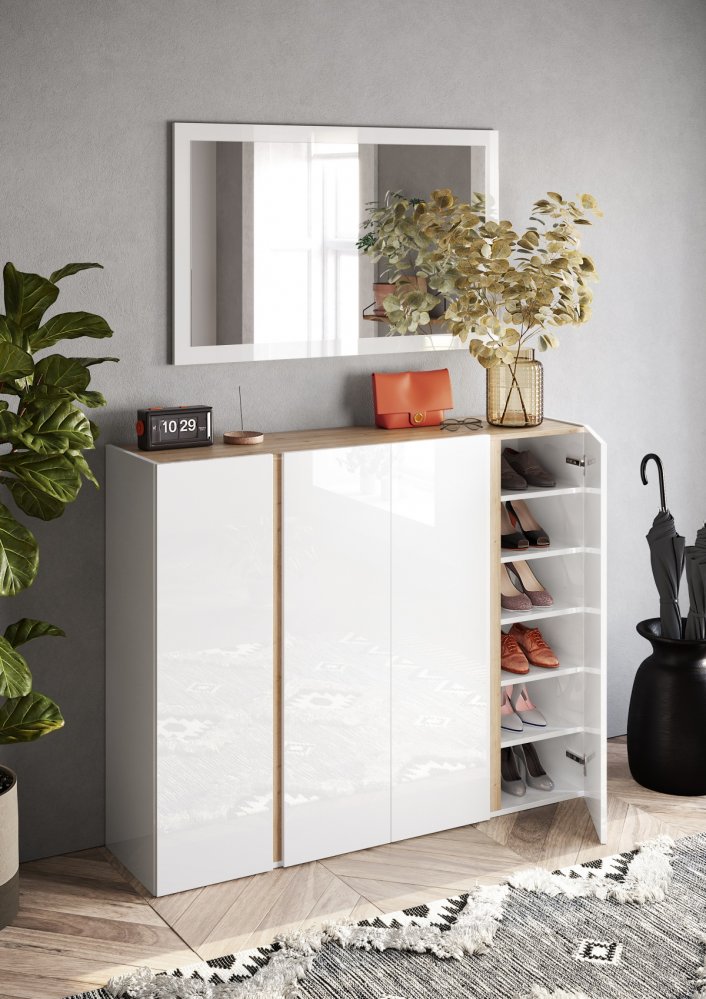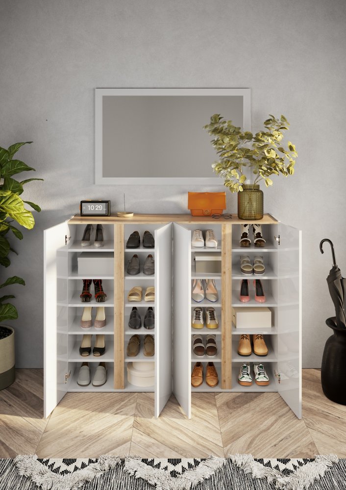Prostorná skříňka na obuv se čtyřmi dvířky. Korpus a čela jsou provedeny v bílém lesku, horní deska a dekorativní aplikace v dekoru dub Cadiz dodávají nábytku přirozený kontrast.