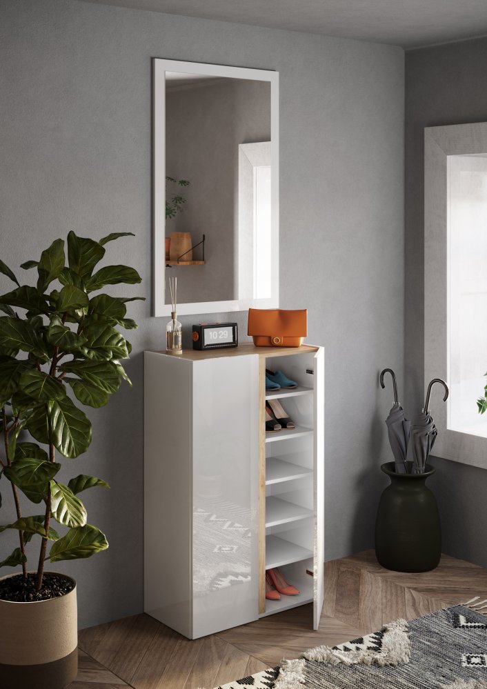 Moderní předsíňová sestava FRAME v kombinaci bílého vysokého lesku a dekoru dub Cadiz představuje elegantní a funkční řešení pro stylově zařízenou předsíň. Čisté linie, lesklé plochy a přírodní akcent dřeva vytvářejí nadčasový vzhled, který působí svěže a zároveň útulně.