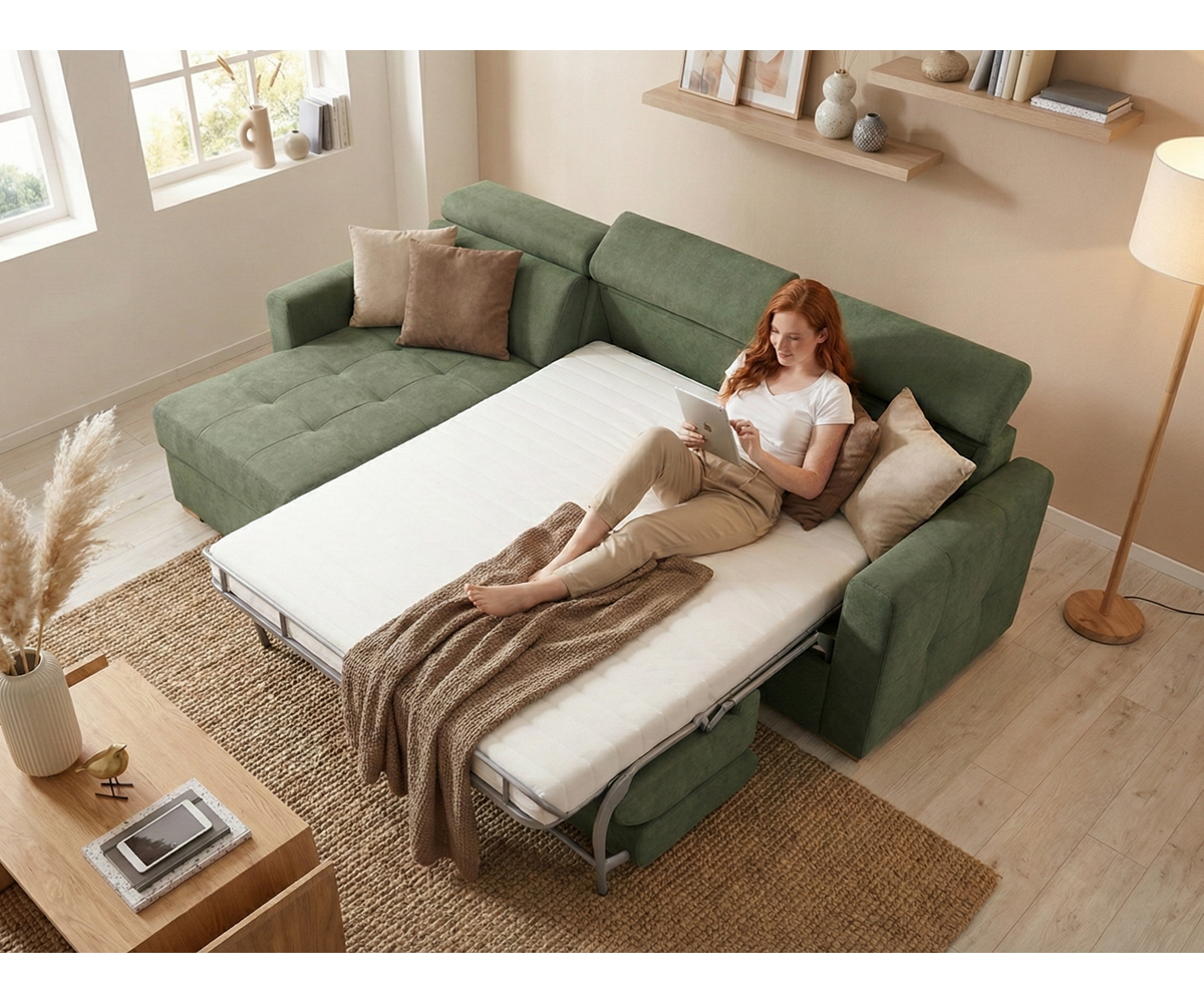 Rozkládací rohová sedací souprava pro každodenní rozkládání NARDO v ultramoderním designu zaujme svou jednoduchostí a elegancí. Jak již vyplývá z názvu, je tento model vhodný i pro ty nejnáročnější, kteří mají rádi co největší pohodlí při odpočinku nebo nemají dostatek prostoru v pokoji pro umístění postele. Sedačka je vybavena značkovým rozkládáním nové generace Nova bi zone od Sedac - Meral. Proti konkurenci je lůžko při rozložení pevně rozděleno na dvě postele vybavené lamelami. Takové řešení zajišťuje vyšší komfort spánku.