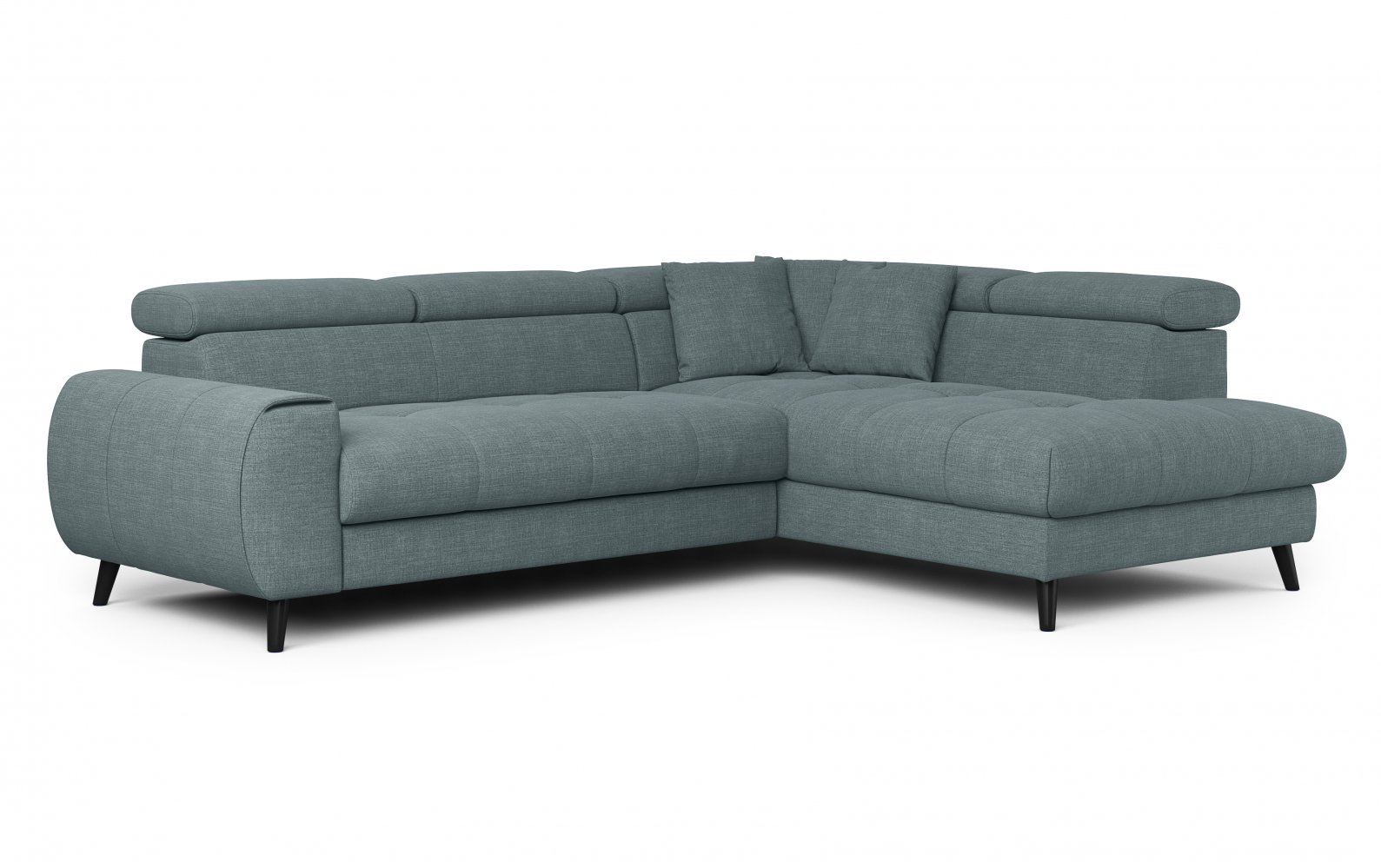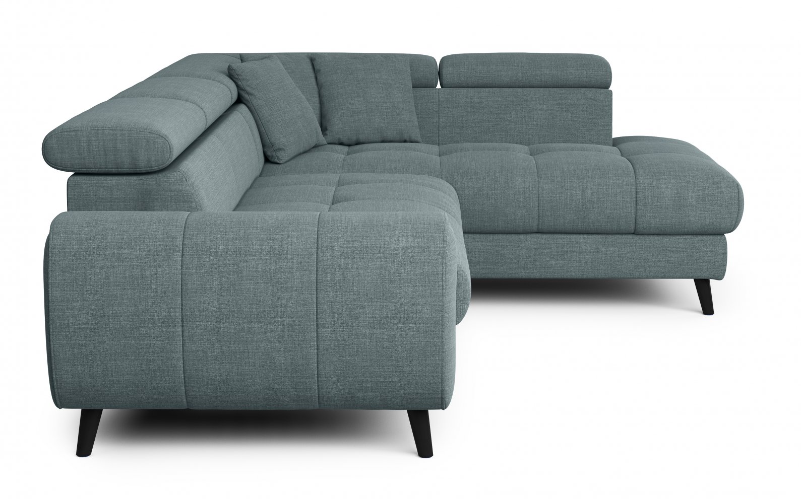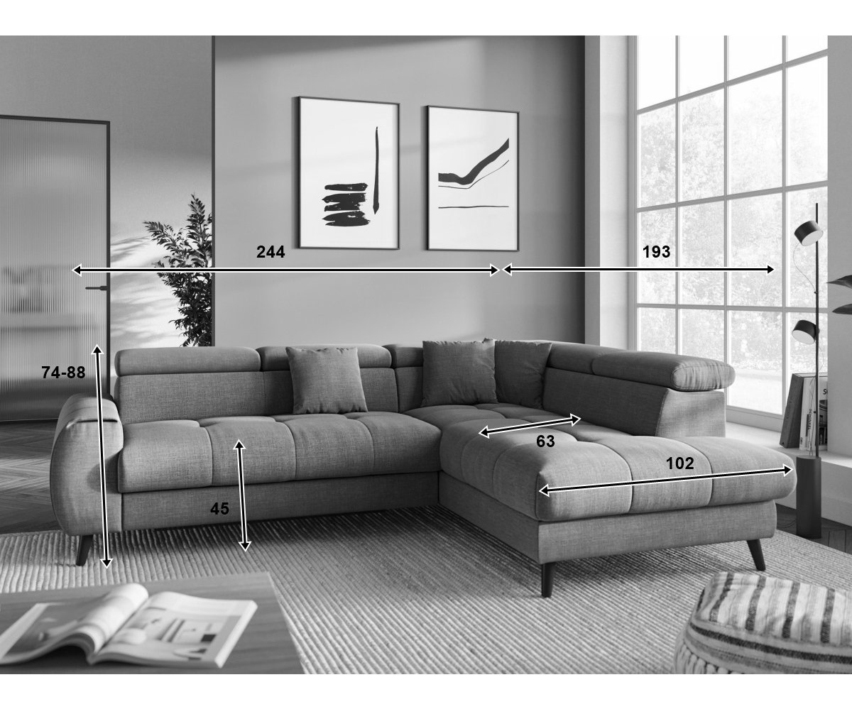 Rohová sedací souprava MIA Vás mile překvapí příjemnými tvary. Pohodlné sezení zaručují pohyblivé opěrky hlavy, které snadno nastavíte jedním pohybem.
