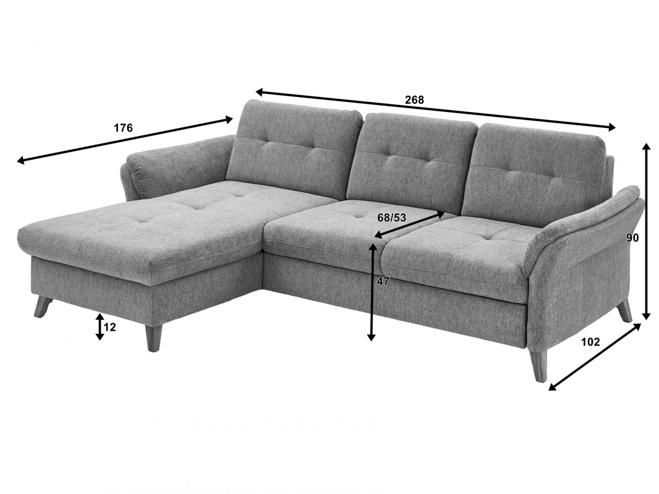 - 1ks rohová sedací souprava s nastavitelnou hloubkou sezení, rozměry 268/90/176 cm