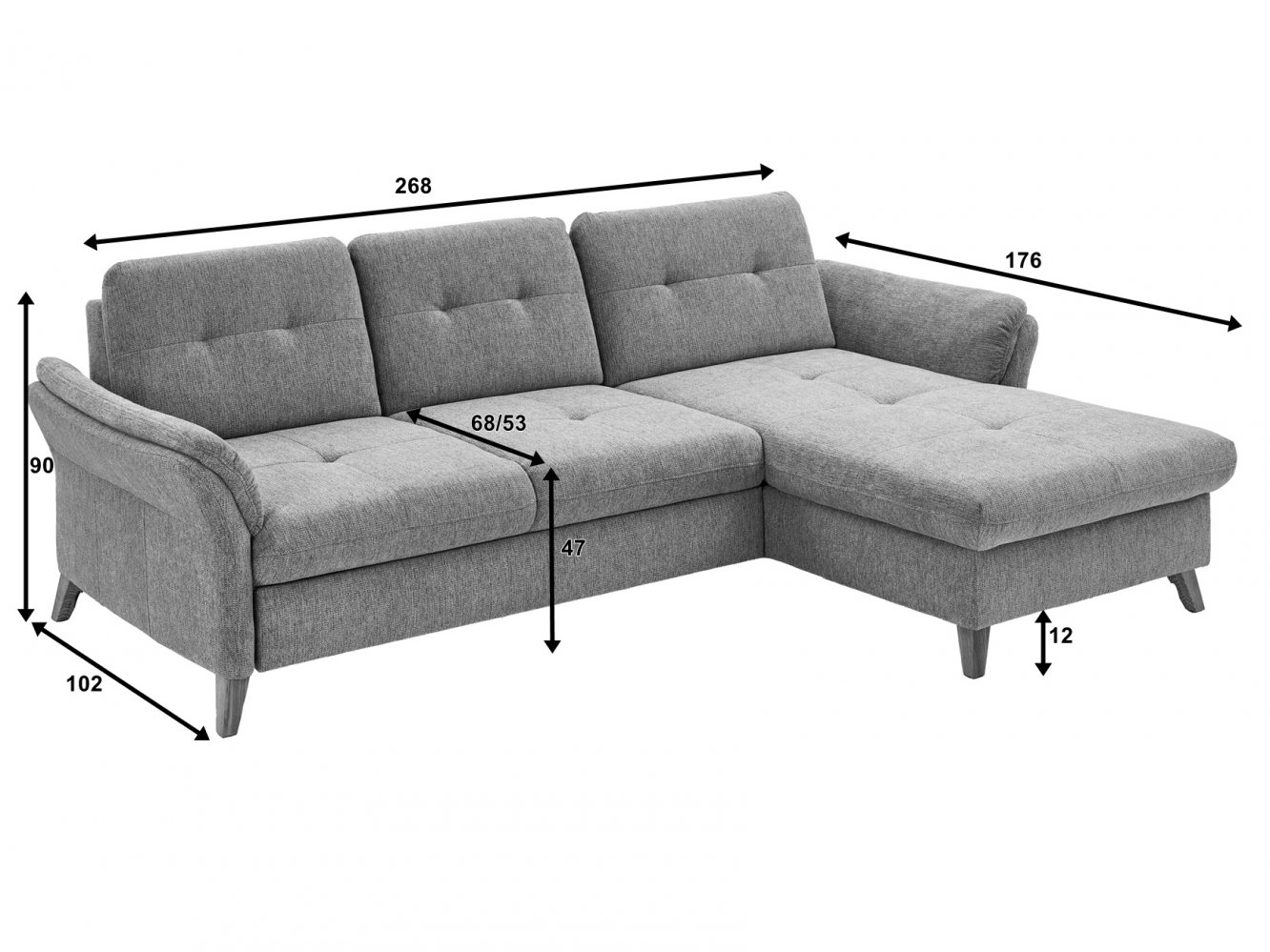 - 1ks rohová sedací souprava s nastavitelnou hloubkou sezení, rozměry 268/90/176 cm