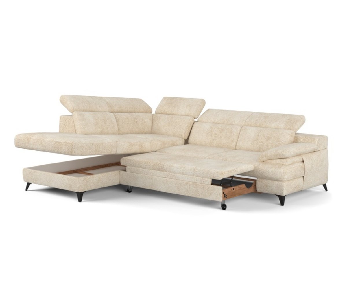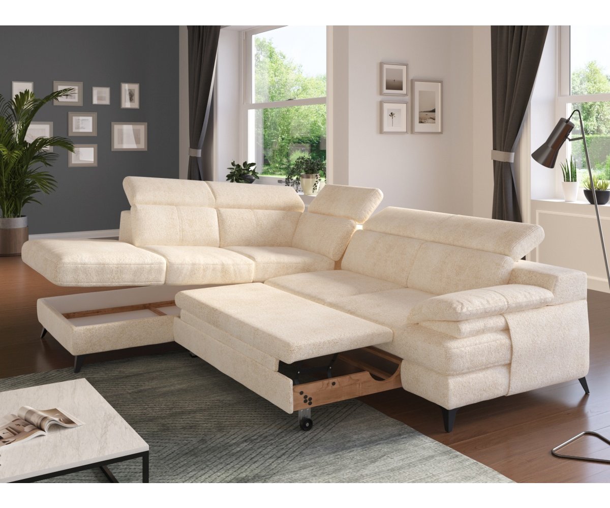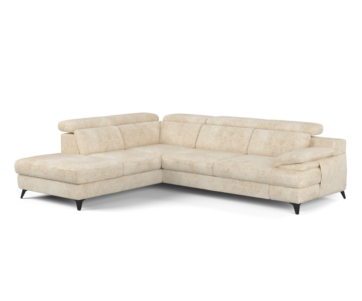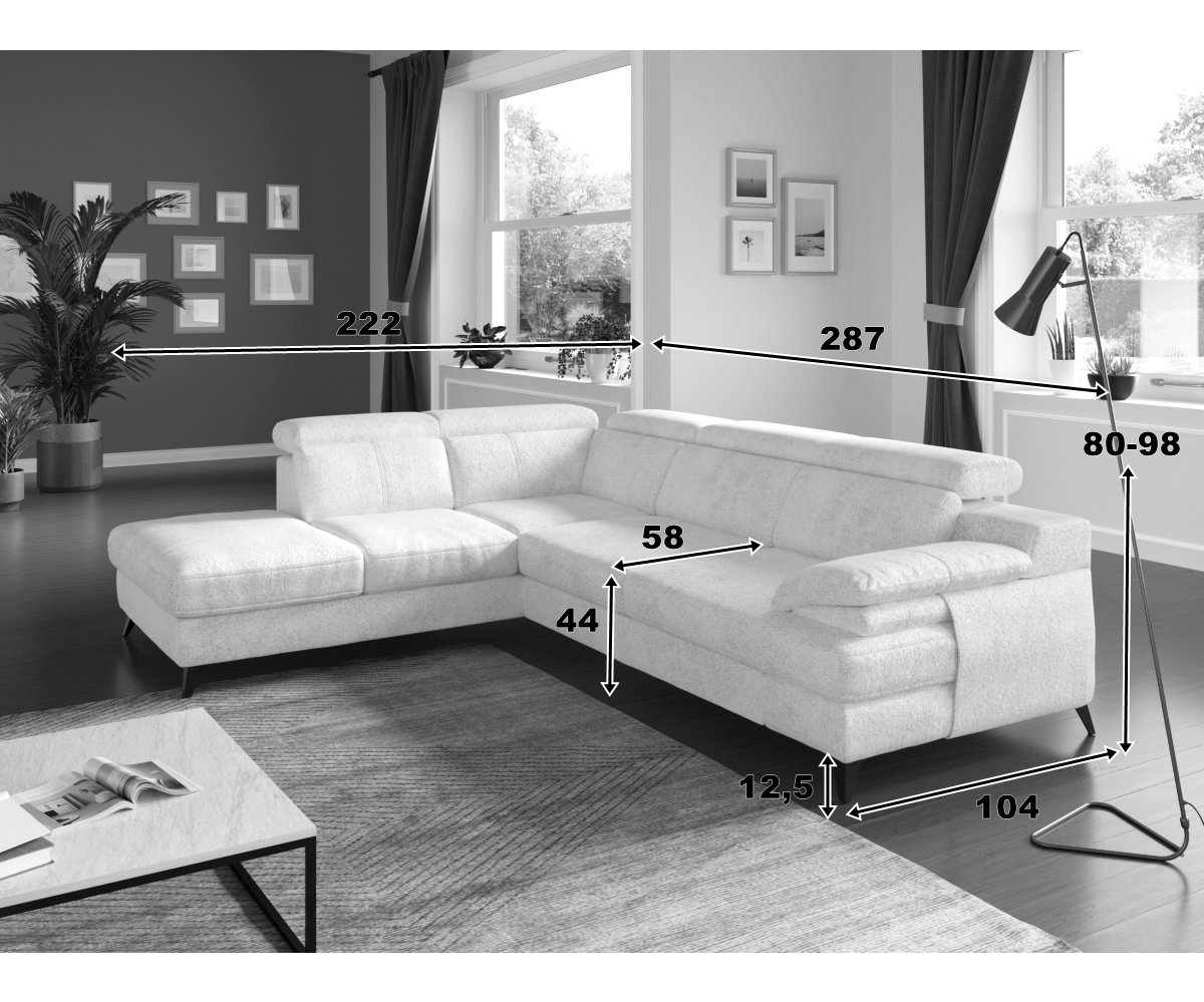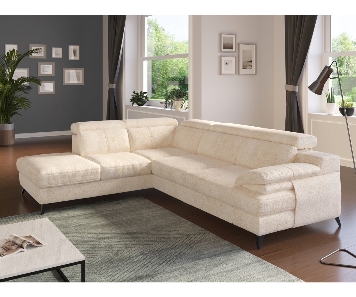 Rohová rozkládací sedací souprava TITUS je skvělou volbou pro ty, kdo hledají spojení komfortu a moderního designu. Je vybavena nastavitelnými opěrkami hlavy, které umožňují individuální přizpůsobení a maximální pohodlí při relaxaci. Kovové vysoké nohy v elegantním černém provedení dodávají sedačce vzdušný vzhled a stabilitu. Součástí je také praktický úložný prostor, ideální pro uložení dek nebo ložního prádla. Měkká, ergonomicky tvarovaná područka poskytuje pohodlnou oporu při odpočinku. Sedačka TITUS se snadno rozkládá, což z ní činí praktický kus nábytku pro každodenní použití i příležitostné spaní hostů.